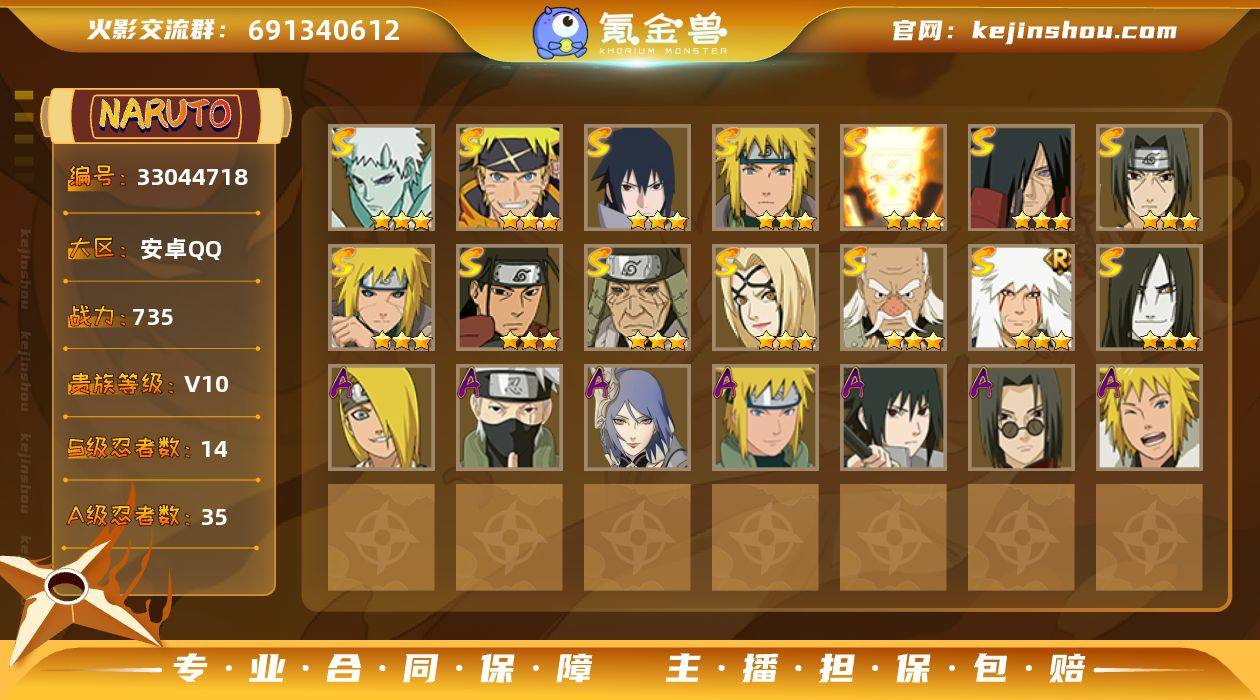 【火影忍者】战斗力:735W+;段位:中忍3阶;本服排名:1685;VIP:V10级;S忍:14个;A忍:35个;通灵兽:18个,S忍:十尾人柱力宇智波带土|漩涡鸣人宇智波佐助|永恒万花筒宇智波佐助|舞之豪杰自来也|大蛇丸(普通)|百豪纲手|波风水门|秽土转生波风水门|千手柱间(普通)|秽土转生宇智波斑|须佐能乎宇智波鼬|忍界大战大野木|九喇嘛连结漩涡鸣人|秽土转生猿飞日斩__A忍:青春爆炸迈特凯|忍界大战日向宁次|四代目土影黑土|火之意志继承者卑留呼|青年长门|青年波风水门|青年艾|近松十人卫千代|半蛇斗篷药师兜|须佐能乎宇智波佐助|九尾查克拉漩涡鸣人|晓大蛇丸|忍界大战秋道丁次|忍界大战我爱罗|新春限定波风水门|新春限定宇智波鼬|万花筒写轮眼宇智波佐助|死司凭血飞段|地怨虞角都|疾风传我爱罗|晓创生迪达拉|飞段(普通) * 4星|神驹佑将小南|万花筒写轮眼旗木卡卡西|神威对决旗木卡卡西|迈特凯(普通) * 4星|宇智波鼬(普通)|干柿鬼鲛(普通) * 4星|蝎(普通) * 4星|猿飞阿斯玛(普通) * 4星|最终章日向雏田|六代目水影长十郎|忍界大战土台|初始形态机械鸣人|侠隐江湖大野木__通灵兽:忍犬(普通)|蓝蛇|蛤蟆吉|忍龟|镰鼬|猿魔|山椒鱼|蜃|蛤蟆仙人|鲛鲨|蛤蟆健|乌鸦(普通...