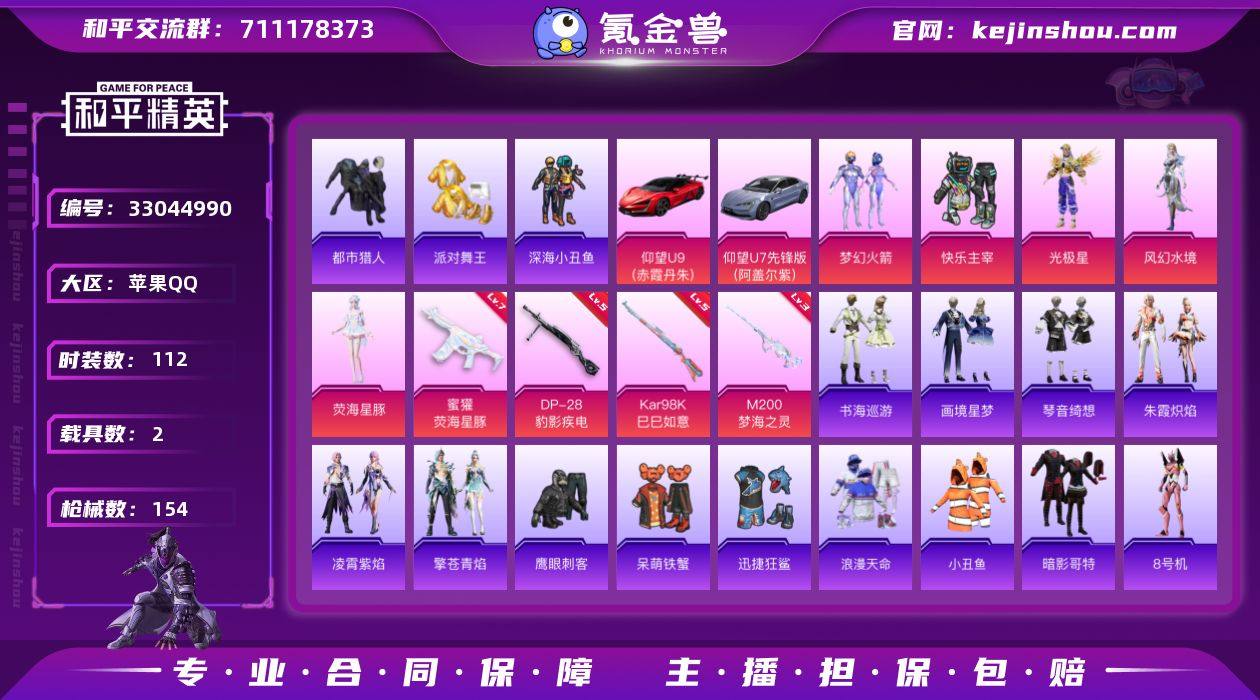 【AZH3475】苹果 手Q【都市金靴子梦幻火箭暗影哥特 满级蜜獾-荧海星豚 2载具】5粉装-7特效枪-2载具-2粉色飞行器-44677热力值-7王牌印记-112套装-154枪皮 【热门品类】:粉装-梦幻火箭,套装-浪漫天命,套装-都市猎人,套装-派对舞王,套装-深海小丑鱼,套装-小丑鱼,套装-暗影哥特,角色-8号机 【粉色套装】:粉装-快乐主宰,粉装-梦幻火箭,角色-光极星,角色-风幻水境,角色-荧海星豚 【粉色枪皮等级】:蜜獾-荧海星豚(七级),ACE32-萌骑漫游(二级),AKS-74U-森灵之息(五级),Kar98K-巳巳如意(五级),Mk14-福马献瑞(五级),M200-梦海之灵(三级),DP-28-豹影疾电(五级) 【粉色载具】:仰望U9(赤霞丹朱),仰望U7(阿盖尔紫) 【粉色枪皮】:蜜獾-荧海星豚,ACE32-萌骑漫游,AKS-74U-森灵之息,Kar98K-巳巳如意,Mk14-福马献瑞,M200-梦海之灵,DP-28-豹影疾电 【粉色飞行器】:幻海精灵飞行器 【粉色降落伞】:快乐主宰降落伞,梦幻火箭降落伞,第五大道降落伞,莲影清波降落伞,星梦奇缘降落伞,精灵之光降落伞,鬼刀降落伞,荧海星豚降落伞,绯穹魔姬降落伞 【稀有套装】:套装-雪国风尚,套装-马上有钱,套装-雏菊兔兔,套装-萝兰蝴蝶,套装-小熊娃娃,角色-俏兔智灵,角...