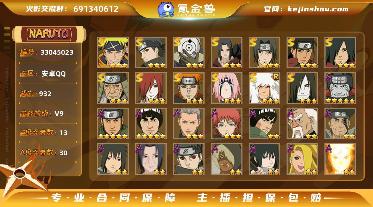 可免费转苹果 V9 932万战力 13S-30A 鬼灯幻月88片 金角银角75片 TT1860 【S级忍者】:长门「秽土转生」(3星),猿飞日斩「秽土转生」(3星),宇智波鼬「秽土转生」(3星),春野樱「忍界大战」(3星),宇智波鼬「须佐能乎」(3星),宇智波止水「须佐能乎」(3星),自来也「舞之豪杰」(3星),大蛇丸(3星),千手柱间(3星),宇智波斑(3星),佩恩「天道」(3星),宇智波斑 「白面具」(3星宇智波斑「白面具」),漩涡鸣人·宇智波佐助(3星) 【A级忍者】:达鲁伊「博人传」(2星),迪达拉「秽土转生」(2星),大蛇丸「晓」(2星),奇拉比(2星),飞段(3星),飞段「死司凭血」(2星),干柿鬼鲛(5星),漩涡鸣人「九尾查克拉」(2星),迈特凯(5星),旗木卡卡西「万花筒写轮眼」(2星),我爱罗「疾风传」(2星),我爱罗「忍界大战」(2星),蝎(3星),小南「神驹佑将」(2星),角都「地怨虞」(2星),猿飞阿斯玛(5星),猿飞阿斯玛「秽土转生」(2星),宇智波止水(2星),宇智波鼬「夏日限定」(2星),宇智波佐助「须佐能乎」(2星),宇智波佐助「万花筒写轮眼」(2星),药师兜「半蛇斗篷」(2星),照美冥「五代目水影」(2星),秋道丁次「忍界大战」(2星),千代「近松十人卫」(2星),土台「忍界大战」(2星),志村团藏(...