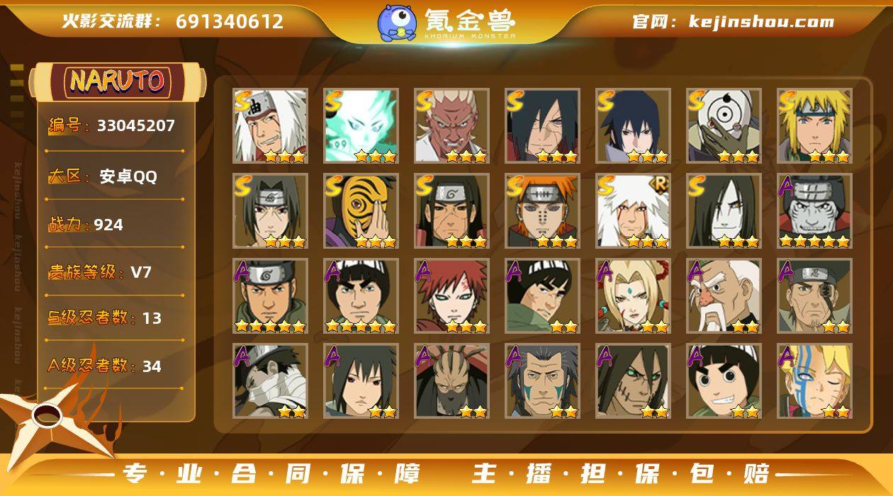 【性价比小号】y7380 战力924w 13s 34a 7500金币 1个198点券A 79片须佐卡卡西 74片自来也 85片金身水门 68片秽土日斩 88片红夜面具男