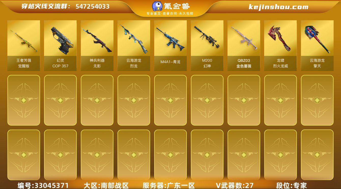 【自带包赔 最高三倍】:南部战区:广东一区-LV102-高阶大元帅-27V-2王者武器数-0炫金武器数 【热门武器】:QBZ03-金色蔷薇,M4A1-青龙,M200-幻神,死亡之眼,COP 357-幻灵,沙鹰-修罗*3 【角色】:影豹(爆破四防),王者影豹(生化四防),乔伊教练,云海玲珑,暗夜-X,飞虎队-X,风暴女,嘉年华灵狐,灵狐者-X,灵狐者-黄金海岸,灵狐者-职业经理,潘多拉-X,潜龙队-X,铁骑荣耀,兔囡囡,雪莉杨,夜玫瑰-幻能朋克,樱-战斗天使,游珑儿 【人偶武器】:加特林-机械猎手,AWM-灵狐-15周年嘉年华,迷你裂空之翼,迷你波特博士*2,迷你火种,迷你生化手雷*2,深渊终结者手雷 【暴走生化】:死亡之眼,超级对讲机 【英雄级武器】:M4A1-青龙,QBZ03-金色蔷薇,无影-神兵利器,黑武士-锦绣游龙,王者芳薇-觉醒版,M200-幻神,炼狱-悦蓝-觉醒版,烈龙-云海游龙,沙鹰-修罗*3,沙鹰-天神*2,COP 357-幻灵,幻灵之锋*2,擎天-云海游龙,龙啸-烈火龙威,高爆手雷-幻灵*2,手雷-云海游龙,闪光弹-幻灵*2,烟雾弹-幻灵*3 道具、段位等以实际验号为准。如账号因没有维护,赛季更新等不可抗因素发生变化,不属于账号质量问题"