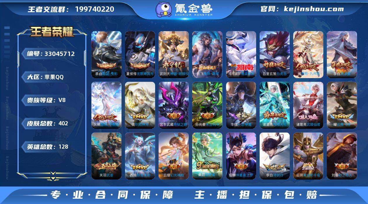 编号97488 不可二次 V8 402皮肤 2典藏 1无双 2珍品传说 24传说 神器·明辉仪 鸣剑·曳影 无限飓风号 怪盗基德 兔狲·蓬尾 白虎志 凤求凰 至尊宝 神威 武圣 愿照·九州拓 愿照·千秋盛 武陵仙君 时雨天司 挚爱之约 东方月初 器灵·浮梦炉 孙行者 飞衡 傲雪梅枪 默契交锋 朱雀志 降魔 海诺-心动手记 女儿国国王 埋骨钱 幻光神枪 云鹰飞将 云霓雀翎 诗剑行 冰锋战神 启明星使