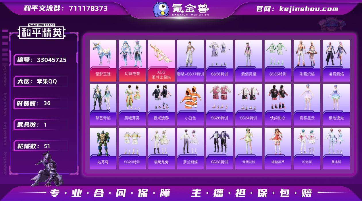 【和平精英】2粉装,3特效枪,1载具,历史最高段位:超级王牌3星 王牌印记3次 热力值:35274,74套装,128枪械,172装备,55战备;套装:套装-梦幻火箭,套装-幻彩电音,套装-黑色伏地魔,套装-竞技名士,套装-长空猛禽,套装-旭日情侣,套装-魅力单车,套装-潮流炫酷,套装-幻世战舞者,套装-迅捷狂鲨,套装-青涩时光,套装-缤纷果语,套装-龙魂突击队,套装-小丑鱼,套装-霓虹街区,套装-狙击之神,套装-光之冒险,套装-绯格组合,套装-王牌教练,套装-青玉碎影,套装-SS24特训,套装-SS25特训,套装-惊鸿侠骨,套装-锦衣飞扬,套装-晨曦薄雾,套装-香桃花海,套装-龙的传人,套装-冰河战士,套装-SS26特训,套装-快闪甜心,套装-春光漫游,套装-老实芭蕉,套装-SS28特训,角色-达芬奇,角色-极地流光,角色-粉雾星云,套装-街头风暴,套装-蝶变,套装-SS29特训,套装-雏菊兔兔,套装-萝兰蝴蝶,角色-紫俏灵猫,套装-异域银装,套装-星途旅人,套装-SS30特训,套装-青团波波,套装-糖糖葫芦,套装-SS31特训,套装-紫幽梦,套装-粉恋花,套装-SS33特训,套装-云朵鹅,套装-SS32特训,套装-青翼流星,套装-蓝冰羽,套装-顶瓜瓜,套装-雪绒豹,套装-狂鲨锋刃,套装-大橘大利,套...