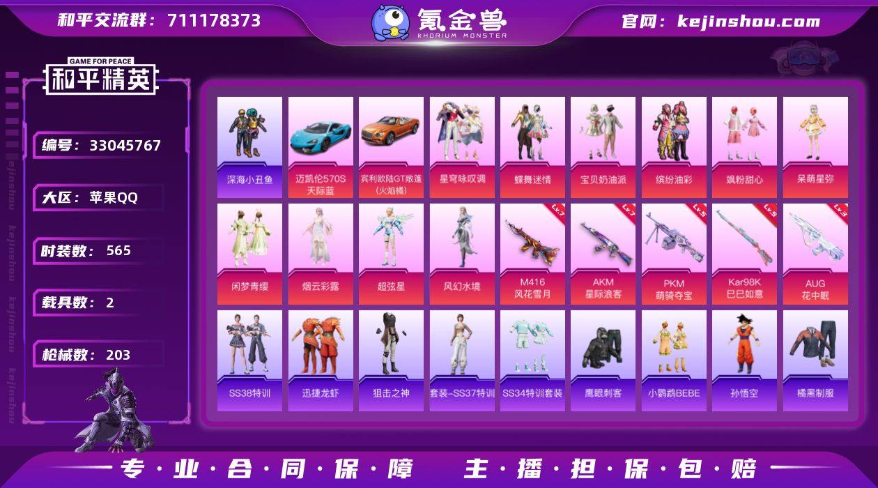 实名: 可修改 时装数: 565 载具数: 2 枪械数: 203 战备数: 135 热门装扮: 蝶舞迷情,深海小丑鱼,宝贝奶油派,鹰眼刺客,缤纷油彩,小鹦鹉BEBE,飒粉甜心,呆萌星弥,闲梦青缨,烟云彩露,超弦星,风幻水境,星穹咏叹调 载具: 迈凯伦570S(天际蓝),宾利欧陆GT敞篷(火焰橘) 稀有枪皮: M416风花雪月,AKM星际浪客,Kar98K-巳巳如意,PKM-萌骑夺宝,AUG-花中眠