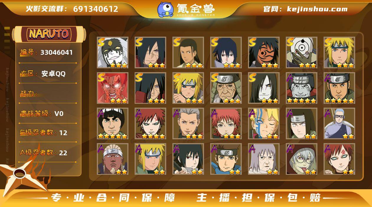 XS264302 需要先进行二次实名 12S级忍者数-22A级忍者数 【S级忍者】:猿飞日斩「秽土转生」(3星),波风水门「秽土转生」(3星),宇智波斑「秽土转生」(3星),宇智波斑「秽土转生·解」(3星),千手柱间「木叶创立」(3星),大蛇丸(3星),波风水门(3星),神秘面具男「红夜之刃」(3星),迈特凯「死门」(3星),宇智波佐助「永恒万花筒」(3星),宇智波斑 「白面具」(3星宇智波斑「白面具」),大筒木桃式(3星) 【A级忍者】:艾「青年」(2星),波风水门「青年」(2星),大蛇丸「晓」(2星),飞段(3星),飞段「死司凭血」(2星),干柿鬼鲛(5星),漩涡博人「桃式显现」(2星),迈特凯(5星),我爱罗「疾风传」(4星),我爱罗「忍界大战」(2星),蝎(3星),角都「地怨虞」(2星),猿飞阿斯玛(5星),猿飞日斩「火影继承人」(2星),宇智波佐助「须佐能乎」(2星),宇智波佐助「万花筒写轮眼」(2星),药师兜「半蛇斗篷」(2星),日向宁次「忍界大战」(2星),长十郎「六代目水影」(2星),猿飞木叶丸「博人传」(2星),千代「近松十人卫」(2星),志村团藏(2星)