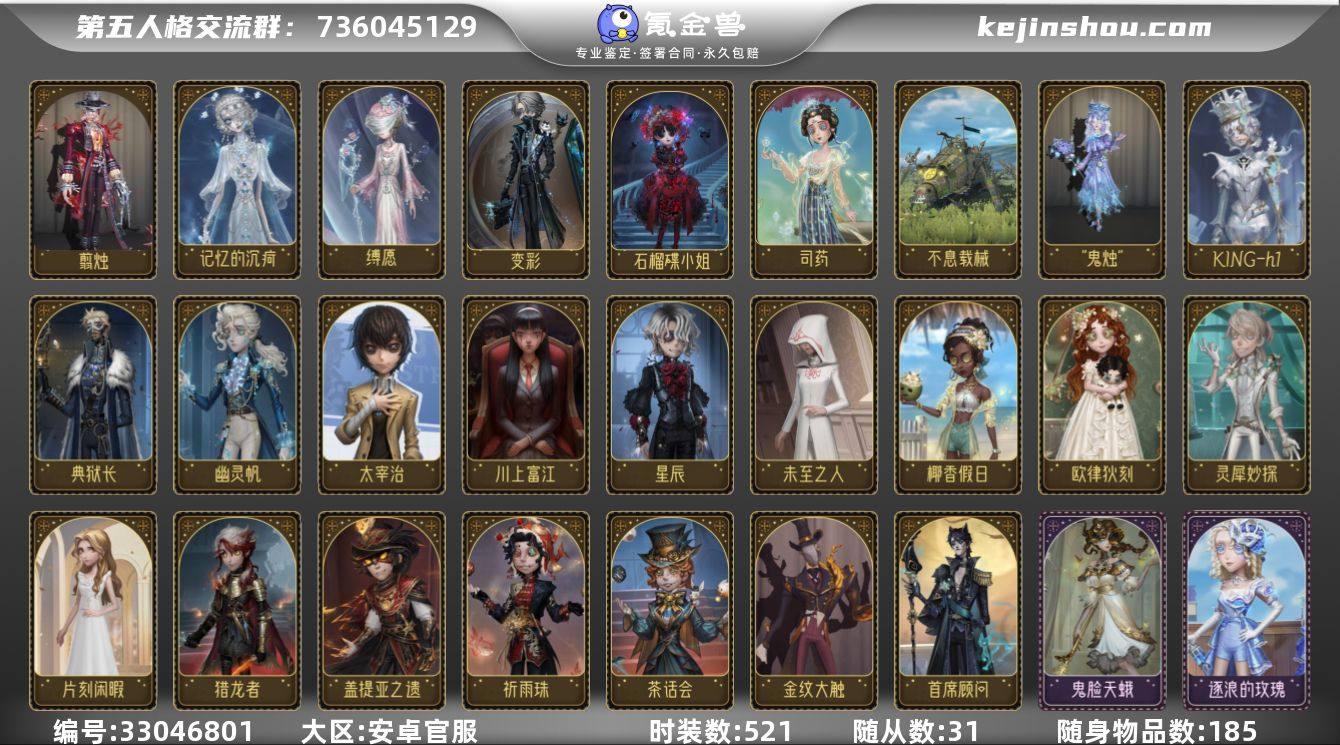账号类型: 邮箱账号 时装数: 521 时装: 病患-星辰,厂长-“阿拉丁”,红蝶-白孔雀,红夫人-女大公,画家-逃亡者,画家-长生,画家-江户川乱步,“杰克”-金纹大触,昆虫学者-动植物学教授,哭泣小丑-烟花盖伊,哭泣小丑-炮弹飞船,蜡像师-淋浴,盲女-甜心蛋糕,梦之女巫-川上富江,前锋-沉眠的兔先生,“囚徒”-宾虚,“囚徒”-灵犀妙探,“囚徒”-冬蝉,“囚徒”-太宰治,入殓师-喜多川祐介,入殓师-“盲区”,宿伞之魂-残花泪,“使徒”-校监夫人,守墓人-列车长,守墓人-壁画修复员,守墓人-异星开采,调香师-时之砂,玩具商-浴石商人,玩具商-线控信号,“小女孩”-滚滚伙伴,邮差-秋日随想,隐士-典狱长,蜘蛛-长腿小姐,杂技演员-茶话会,作曲家-猎龙者,厂长-丰悦,佣兵-火炮手,咒术师-椰香假日,“小女孩”-欧律狄刻,心理学家-莱拉,幸运儿-星航之旅,隐士-首席顾问,杂技演员-祈雨珠,木偶师-KING-h1,守夜人-KNIGHT-c3,拉拉队员-BISHOP-f1,勘探员-盖提亚之遗,作曲家-幽灵帆,爱丽丝·德罗斯-未至之人,爱丽丝·德罗斯-片刻闲暇,歌剧演员-幕外之音,渔女-百万人鱼,渔女-破魔之刃,邮差-报纸怪客,调酒师-逐浪的玫瑰,渔女-鬼脸天蛾,古董商-墨韵,宿伞之魂-桃面书生,昆虫学者-“鬼烛”,“法罗女士”-芳泽霞,蜘蛛-聚光灯下,“记录员”-删除符,“愚人金”...