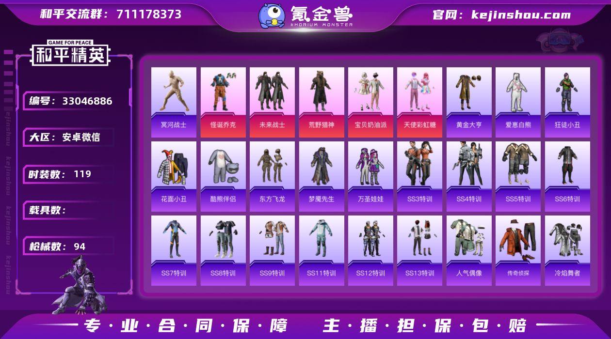 【AZH3122】安卓 微信【木乃伊 怪诞乔克 粉熊背包】5粉装-0特效枪-0载具-1粉色飞行器-34369热力值-1王牌印记-119套装-94枪皮 【热门品类】:粉装-怪诞乔克,套装-冥河战士,套装-黄金大亨 【粉色套装】:粉装-未来战士,粉装-荒野猎神,粉装-怪诞乔克,粉装-宝贝奶油派,粉装-天使彩虹糖 【粉色飞行器】:马卡龙飞行器 【粉色降落伞】:未来战士降落伞,粉色回忆降落伞,荒野猎神降落伞,甜心宝贝降落伞,马卡龙降落伞 【稀有枪皮】:AKM-冰凉西瓜,AKM-破晓战魂,AKM-荒野猎神,AKM-霓虹街区,M16A4-冥河战士,M16A4-生命誓言,M16A4-魔法学院,SCAR-L-未来战士,SCAR-L-炫彩节奏,SCAR-L-生命誓言,SCAR-L-粉色回忆,SCAR-L-雷霆特警,M416-红色方程式,M416-蓝色火焰,GROZA-雷霆特警,AUG-小丑,QBZ-原初圣火,QBZ-诡娃娃,M762-小丑,M762-牛气冲天,M762-甜心宝贝,M762-诡娃娃,Mk47-百万伏特,Mk47-粉色回忆,G36C-荒野猎神,UZI-小丑,UZI-生命誓言,UMP45-星际漫游,UMP45-粉色回忆,UMP45-荒野猎神,UMP45-诡娃娃,Vector-南瓜骑士,汤姆逊-小丑,汤姆逊-像素花束,野牛-扶摇飞仙,MP5K-繁花小夜曲,Kar98K-小丑,Kar98K-诡娃娃,Kar98K-马卡龙,M24-未来战士,M24...