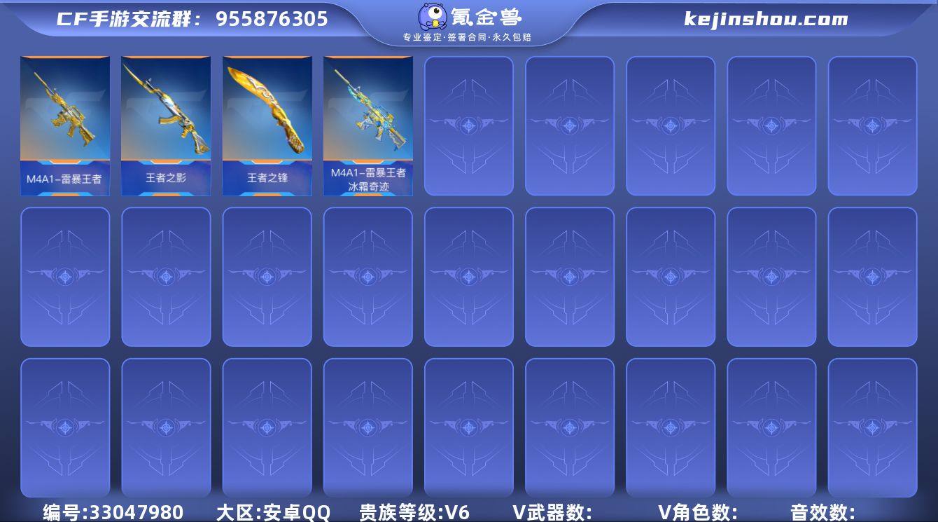 安卓Q\贵族6\炎龙侠&帝皇侠\M4A1-雷暴王者-冰霜奇迹\M200-竞技荣光\COP357-堕天神\王者之锋\王者之影\详情见图