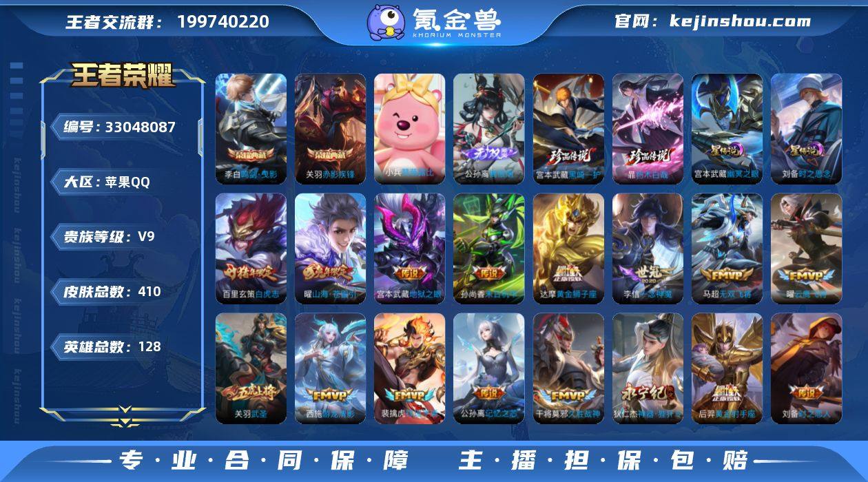 【高性价比v9·29传说·铃舟系梦天幕·离恨烟·黑崎一护·朽木白哉·鸣剑曳影·赤影疾锋·山海苍雷引·神器狴犴令·武圣·白虎志·无二次包过】w22672-苹果Q-128英雄-410皮肤-22王者印记-300铭文-贵族积分12w【贵族9】【2典藏·1无双·2珍品·2星传说·29传说·2天幕·13按键】【因赛季更新游戏段付以上号为准!】 【英雄全皮】:刘邦全皮,孙权全皮,狂铁全皮,猪八戒全皮,敖隐全皮,阿古朵全皮,空空儿全皮 【荣耀典藏】:李白鸣剑曳影,关羽赤影疾锋 【无双皮肤】:公孙离离恨烟 【珍品传说】:宫本武藏黑崎一护,暃朽木白哉 【星元皮肤】:刘备时之思念,宫本武藏幽冥之眼 【天幕】:铃舟系梦天幕,共赏芳华天幕 【传说皮肤】:后羿神树通天,裴擒虎祥瑞亨通,桑启鸣野蒿,马可波罗妄想实况,公孙离记忆之芯,花木兰燃星之曲,曜山海苍雷引,吕布怒海麟威,狄仁杰神器狴犴令,百里守约碎云,马超无双飞将,赵云淬星耀世,王昭君乞巧织情,西施游龙清影,虞姬启明星使,关羽武圣,曜云鹰飞将,李信一念神魔,刘备时之恋人,张良黄金白羊座,干将莫邪久胜战神,虞姬云霓雀翎,达摩黄金狮子座,百里玄策白虎志,梦奇胖达荣荣,后羿黄金射手座,孙尚香末日机甲,宫本武藏地狱之眼,孙悟空地狱火...