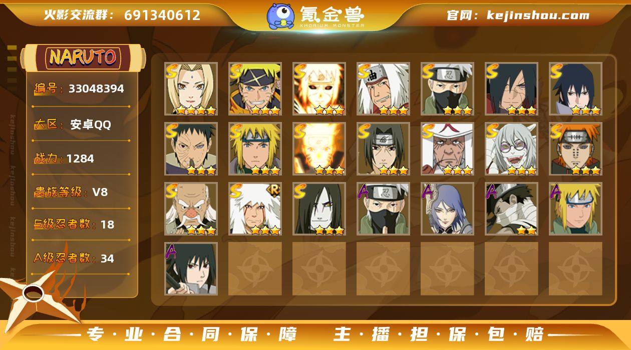【火影忍者】战斗力:1284W+;段位:上忍2阶;本服排名:154;VIP:V8级;S忍:18个;A忍:34个;通灵兽:18个,S忍:秽土转生解宇智波斑|白面具宇智波斑|忍界大战宇智波带土|须佐能乎旗木卡卡西|九喇嘛连结波风水门|天道佩恩|传说中的三忍自来也|漩涡鸣人宇智波佐助|永恒万花筒宇智波佐助|舞之豪杰自来也|大蛇丸(普通)|纲手(普通) * 4星|波风水门|须佐能乎宇智波鼬|仙人模式药师兜|忍界大战大野木|九喇嘛连结漩涡鸣人|猿飞日斩(普通)__A忍:青春爆炸迈特凯|妖怪奇谭纲手|仙人模式巳月|幻之真容旗木卡卡西|忍界大战李洛克|忍界大战日向宁次|四代目土影黑土|青年长门|忍界大战奇拉比|青年波风水门|青年艾|近松十人卫千代|须佐能乎宇智波佐助|晓大蛇丸|忍界大战秋道丁次|忍界大战我爱罗|死司凭血飞段|疾风传我爱罗 * 3星|飞段(普通) * 4星|神驹佑将小南|仙人模式漩涡鸣人|神威对决旗木卡卡西|迈特凯(普通) * 5星|宇智波鼬(普通)|干柿鬼鲛(普通) * 5星|秽土转生桃地再不斩|蝎(普通) * 5星|绯流琥蝎|猿飞阿斯玛(普通) * 5星|桃式显现漩涡博人|最终章日向雏田|六代目水影长十郎|宇智波泉奈|忍界大战土台 * 3星__通灵兽:忍犬(普通)|蓝蛇|蛤蟆吉|忍龟|砂之守鹤|镰...