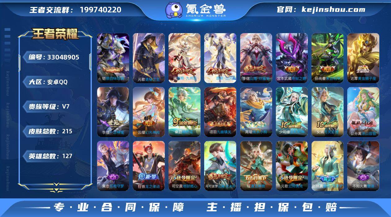 实名: 可修改 性别: 男号 贵族等级: V7 英雄数: 127 皮肤数: 215 荣耀水晶: 银白咏叹调 传说皮: 黄金狮子座,一念神魔,末日机甲-孙尚香,地狱之眼,山海·炽霜斩,幻光神枪,诡秘之主 限定皮: 遇见飞天,梁祝,高山流水,五谷丰年,山海·玄木吟,鸣野蒿,逐霄战戟,愿照·山河定,愿照·九州拓 亮点: 【优质装备】:银白咏叹调(倪克斯侍卫),黄金狮子座,一念神魔,末日机甲-孙尚香(绿蚂蚱),地狱之眼,山海·炽霜斩(李信年限),诡秘之主,涂山容容