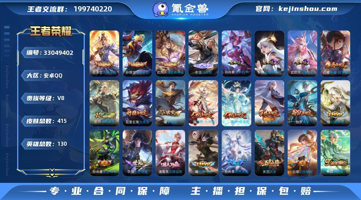 【特价出售/店主推荐】安卓Q-V8-永恒钻石II段位-130英雄-415皮肤-3典藏皮肤-1典藏英雄-1无双-3星传说-25传说-126史诗 【英雄全皮】:刘邦全皮,孙权全皮,猪八戒全皮,敖隐全皮,影全皮 【荣耀典藏】:武则天英雄,孙悟空全息碎影,武则天倪克斯神谕,花木兰九霄神辉 【无双皮肤】:李信问心剑 【传说皮肤】:云缨神骥越千峰,后羿神树通天,妲己愿照众生和,澜愿照九州拓,云缨幻光神枪,桑启鸣野蒿,花木兰燃星之曲,孙尚香异界灵契,曜李逍遥 ,镜炽阳神光,虞姬启明星使,关羽武圣,曜云鹰飞将,李信一念神魔,伽罗太华,貂蝉猫影幻舞,干将莫邪久胜战神,百里玄策白虎志,花木兰冠军飞将,梦奇胖达荣荣,诸葛亮武陵仙君,貂蝉仲夏夜之梦,李白凤求凰,孙尚香末日机甲,武则天海洋之心 【限定皮肤】:白起狰,姜子牙天穹之誓,狄仁杰阴阳师,虞姬凯尔特女王,赵云皇家上将,墨子神迹守卫,妲己时之彼端,嬴政白昼王子,孙尚香蔷薇恋人,孙尚香异界灵契,鲁班七号狮舞东方,庄周蜃楼王,庄周玄嵩,庄周高山流水,高渐离死亡摇滚,阿轲迷踪丽影,孙膑妖精王,扁鹊炼金王,扁鹊奇幻香踪,白起夜都怪侠,芈月重明,芈月幻夜卜梦,吕布猎兽之王,吕布御风骁将,周瑜赤莲之焰,...