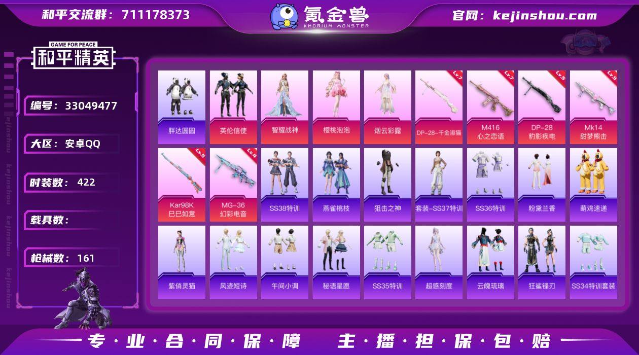 HY 实名: 可修改 时装数: 422 枪械数: 161 战备数: 114 热门装扮: 恶魔喵喵,激萌罗小黑,胖达圆圆,烟云彩露,英伦信使,樱桃泡泡,智耀战神 稀有枪皮: M416心之恋语,DP-28-千金淑猫,Kar98K-巳巳如意,MK14-甜梦熊击,MG-36-幻彩电音,DP-28-豹影疾电