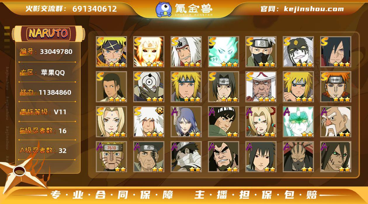 IOS/16S忍/32A忍/战力1138W/V11/区服754 【S忍者】 宇智波佐助「漩涡鸣人」,大筒木桃式,宇智波斑「秽土转生·解」,千手柱间「木叶创立」,自来也「舞之豪杰」,旗木卡卡西「须佐能乎」,大筒木舍人「最终章」,自来也「传说中的三忍」,宇智波斑「白面具」,波风水门「秽土转生」,宇智波鼬「须佐能乎」,佩恩「天道」,猿飞日斩,波风水门,纲手,波风水门「九喇嘛连结」, 【A忍者】 小南「神驹佑将」,机械鸣人「初始形态」,大野木「侠隐江湖」,纲手「妖怪奇谭」,巳月「仙人模式」,迈特凯「青春爆炸」,土台「忍界大战」,漩涡博人「桃式显现」,日向雏田「最终章」,旗木卡卡西「幻之真容」,李洛克「忍界大战」,蝎「绯流琥」,宇智波泉奈,神农「羁绊」,桃地再不斩「秽土转生」,角都「秽土转生」,神秘面具男「忍者之路」,波风水门「青年」,宇智波佐助「须佐能乎」,千代「近松十人卫」,秋道丁次「忍界大战」,大蛇丸「晓」,飞段「死司凭血」,飞段,迪达拉,我爱罗「疾风传」,蝎,干柿鬼鲛,宇智波鼬,猿飞阿斯玛,迈特凯, PX_2481870