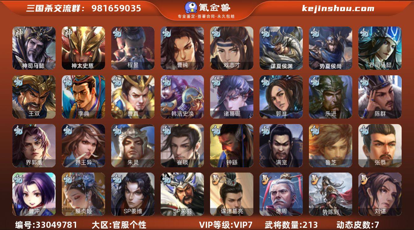官阶:领军将军;VIP等级:VIP7;史诗武将数量:10;动态皮肤数量:7;武将总数:213;史诗宝珠数量:8;将魂数量:426;神将:2;魏国史诗武将:2;蜀国史诗武将:2;吴国史诗武将:1;群史诗武将:2