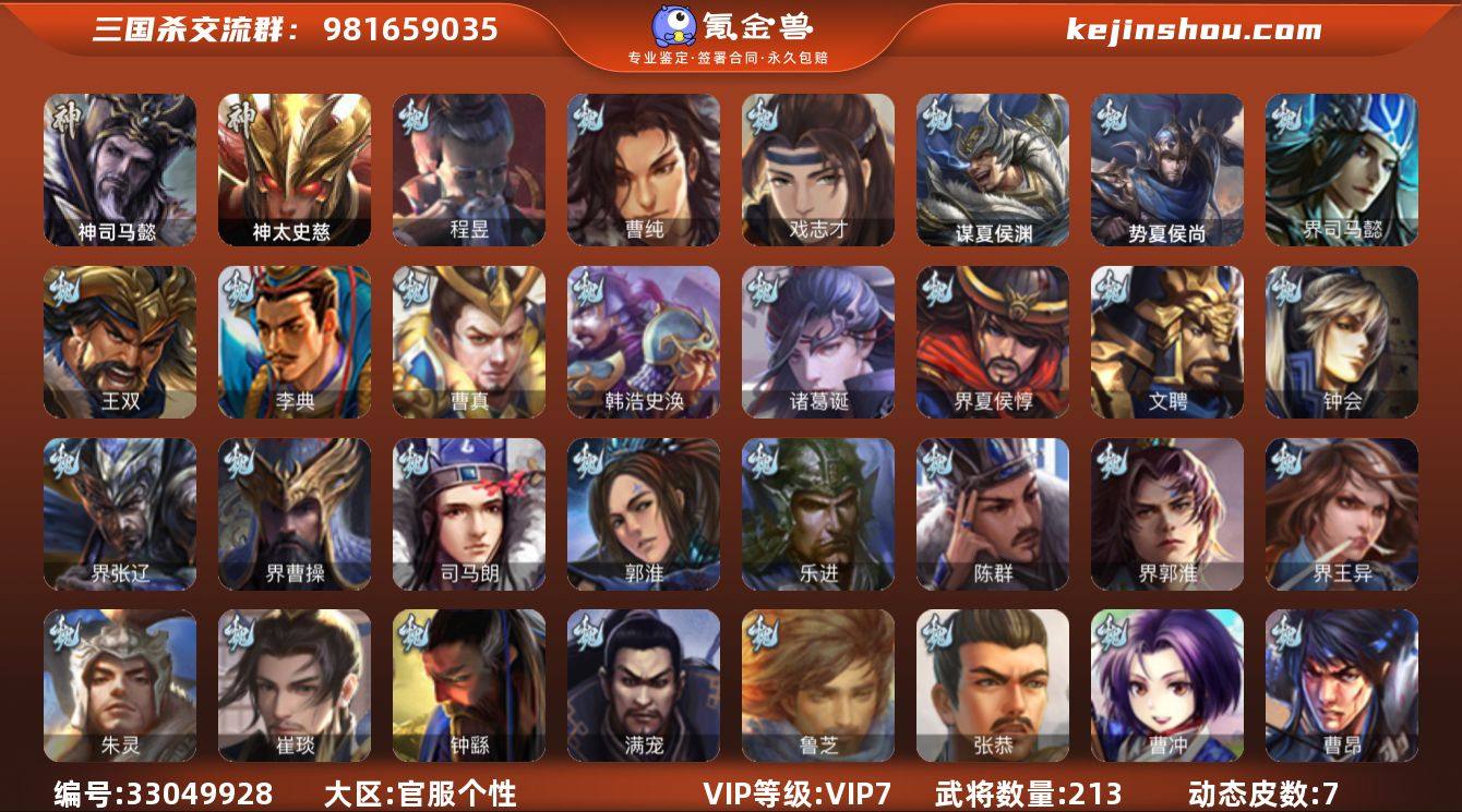 官阶:领军将军;VIP等级:VIP7;史诗武将数量:10;动态皮肤数量:7;武将总数:213;史诗宝珠数量:8;将魂数量:426;神将:2;魏国史诗武将:2;蜀国史诗武将:2;吴国史诗武将:1;群史诗武将:2