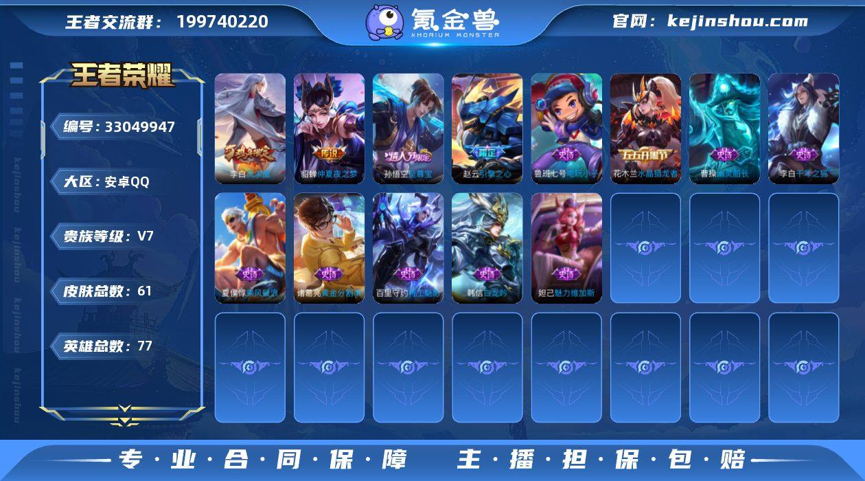 V7 3传说 77英雄 61皮肤 可修改实名 男号 【稀有英雄】韩信(韩跳跳),夏洛特(夏师傅),橘右京(橘子),娜可露露(鸟人),不知火舞,赵云 【传说皮】仲夏夜之梦(大飞蛾),末日机甲-孙尚香(绿蚂蚱) 【赛季/战令皮】炼金王(s6),凯尔特女王(s7),狰(s8),饕餮(s9),穷奇(s12),朔风刀(s17),疑决卦(s19),原初探秘者(s21) 【史诗皮】紫霞仙子,电玩小子(小书包),白龙吟,黄金分割率,特工魅影,千年之狐,幽灵船长,乘风破浪,水晶猎龙者,魅力维加斯 【限定皮】至尊宝,凤求凰(白切鸡),逐梦之星,逐梦之影,引擎之心 【普通皮】海滩丽影,海滩派对,皇家上将,魔术师,化身博士,纽约教父,次元突破,功夫老勺,教廷特使,进击墨子号,阴阳师,死亡骑士,少女阿狸,拳王,如懿,圆桌骑士-太乙真人,孤猎,修竹墨客,伊势巫女,三太子,第七人偶,埃及法老,福禄兄弟,蔷薇王座,潮流仙人,东海龙王,星航指挥官,精灵王,芝加哥教父,午夜歌剧院,街头旋风,绝影神枪,致命风华,特种部队,隐刃,华尔街大亨