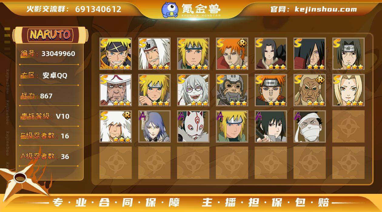 【火影忍者】战斗力:867W+;段位:下忍2阶;VIP:V10级;S忍:16个;A忍:36个;通灵兽:15个,S忍:白面具宇智波斑|超佩恩天道|天道佩恩|传说中的三忍自来也|漩涡鸣人宇智波佐助|秽土转生宇智波鼬|舞之豪杰自来也|纲手(普通)|波风水门|秽土转生波风水门|秽土转生宇智波斑|须佐能乎宇智波鼬|秽土转生半藏|三代目雷影艾|仙人模式药师兜|猿飞日斩(普通)__A忍:青春爆炸迈特凯|漂泊浪客宇智波带土|仙人模式巳月|四代目土影黑土|木叶上忍猿飞木叶丸|青年长门|忍者之路神秘面具男|秽土转生迪达拉|青年波风水门|漂泊武士桃地再不斩|近松十人卫千代|半蛇斗篷药师兜|须佐能乎宇智波佐助|九尾查克拉漩涡鸣人|晓大蛇丸|忍界大战秋道丁次|夏日泳装小南|万花筒写轮眼宇智波佐助|五代目水影照美冥|死司凭血飞段|地怨虞角都|疾风传我爱罗 * 3星|迪达拉(普通)|飞段(普通) * 4星|神驹佑将小南|仙人模式漩涡鸣人|万花筒写轮眼旗木卡卡西|迈特凯(普通) * 5星|宇智波鼬(普通)|干柿鬼鲛(普通) * 5星|绯流琥蝎|蝎(普通)|猿飞阿斯玛(普通) * 5星|最终章日向雏田|六代目水影长十郎|宇智波泉奈__通灵兽:忍犬(普通)|蓝蛇|蛤蟆吉|忍龟|镰鼬|猿魔|山椒鱼|蜃|蛤蟆仙人|鲛鲨|蛤蟆健|乌鸦...