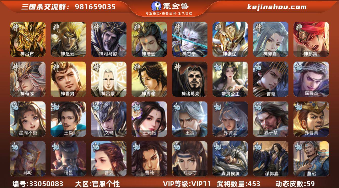 官阶:大将军;VIP等级:VIP11;史诗武将数量:71;动态皮肤数量:59;武将总数:453;史诗宝珠数量:3;将魂数量:7491;神将:11;魏国史诗武将:32;蜀国史诗武将:14;吴国史诗武将:15;群史诗武将:19 神吕布,神赵云,神司马懿,神陆逊,神甘宁,神张辽,神郭嘉,神孙策,神荀彧,神诸葛亮,神鲁肃,曹髦,星周不疑,王粲,王元姬,王凌,界钟会,界于禁,界曹真,郝昭,曹婴,曹纯,戏志才,谋曹丕,清河公主,程昱,关索,谋诸葛亮,马云騄,谋赵云,谋马超,赵襄,张星彩,王平,沙摩柯,界黄忠,花鬘,董允,谋关羽,势魏延,张奋,周处,吴景,孙寒华,骆统,留赞,界徐盛,界步练师,贺齐,势陆郁生,势太史慈,文鸯,谋孙尚香,十常侍,界沮授,左慈,张让,张琪瑛,星黄忠,星甘宁,麹义,庞德公,刘焉,沮授,界左慈,界李儒,卑弥呼,谋张角,星董卓,兀突骨,司马昭,神吕蒙,神周瑜,势夏侯尚,SP关羽,SP曹仁,SP蔡文姬,乐进,曹昂,诸葛诞,朱灵,文聘,SP姜维,张春华,钟会,曹冲,郭淮,满宠,界王异,界曹操,界司马懿,界夏侯惇,界张辽,界许褚,界郭嘉,李典,曹真,韩浩史涣,陈群,曹叡,曹休,钟繇,司马朗,王基,李通,郭皇后,孙资刘放,辛宪英,界甄姬,吕虔,鲁芝,蒯越蒯良,界典韦,界荀彧,界徐晃,杜畿,界曹丕,毌丘俭,界邓艾,张恭,贾逵,界曹植,界曹彰,界满宠,界郭淮,卞...