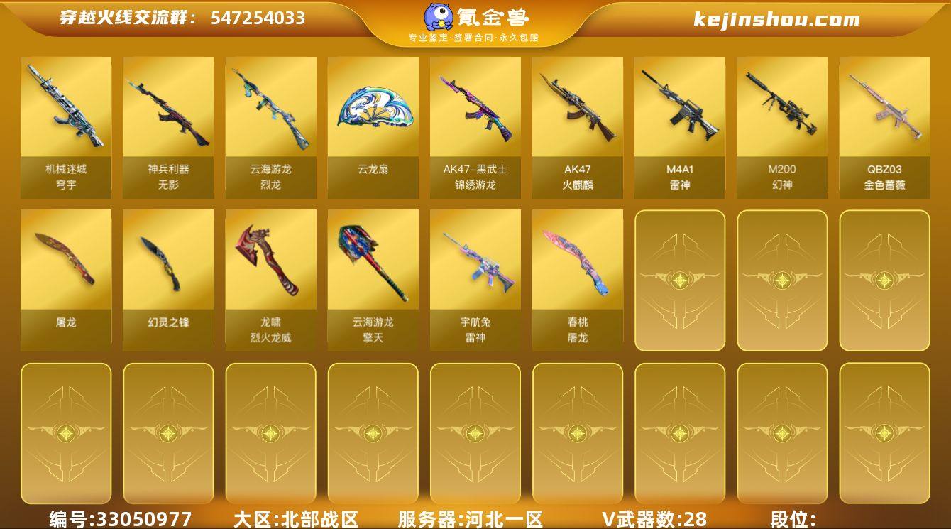 E194356(钱包不能注销)cf北部/河北一区/28V/幻神/火麒麟/雷神*2/无影神兵利器/黑武士锦绣游龙/QBZ金色蔷薇/烈龙/多皮可排