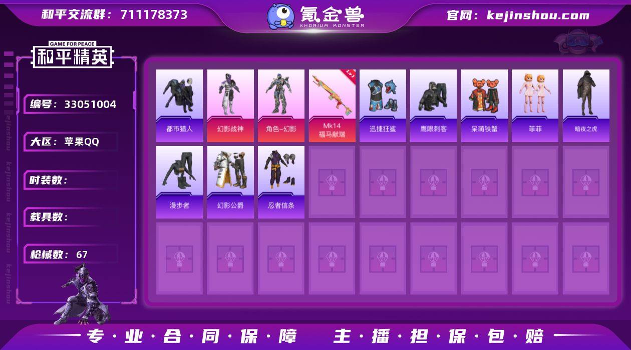 XS11518苹果手Q-1粉装-3特效枪-42套装-67枪皮-2王牌印记-不朽星钻Ⅳ-17169热力值【1粉装】幻影战神【3特效枪】ACE32-萌骑漫游[5级],DP-28-鸢尾珑雾[3级],Mk14-福马献瑞[5级]【2稀有】忍者信条,都市猎人【4飞行器】狂鲨锋刃飞行器,炫彩糖果飞行器,登顶巅峰飞行器,云朵驼驼飞行器【2头盔】幻影战神头盔,深海小丑鱼头盔【2背包】深海小丑鱼背包,幻影战神背包【103其它衣服和枪皮】旭日情侣,SS36特训,福马献瑞,画境星梦,玩偶服-菲菲,迅捷龙虾,海岛探路者,燕雀桃枝,漫步者,呆萌铁蟹,疯狂小兔子,青翼流星,迅捷狂鲨,马上有钱,红釉青花,弄潮海豚,王牌教练,阳光火鸡,琴音绮想,神秘领域,暗夜之虎,角色-紫俏灵猫,冰冻风暴,狂鲨锋刃,幻影公爵,炫彩糖果,玩偶服-会说话的汤姆猫,鹰眼刺客,魅力单车,阳光菠萝,狙击之神,潮流炫酷,龙的传人,雪国风尚,角色-绯色魅影,SS38特训,绮丽涂鸦,雨过天青,SS37特训,20-H-狂鲨锋刃,沙漠之鹰-雨过天青,SCAR-L-夜灯,十字弩-异瞳寒姬,SCAR-L-炫彩节奏,MG3-幻世战舞者,ACE32-冰晶雪宝,P90-紫矿核心,S1897-炫彩节奏,铝热弹-炫彩糖果,MP7-G-锦灰蝶梦,Mini14-穿刺龙虾,AA12-G-雨过天青,S686-生命誓言,MP5K-画境星梦,M762-登顶巅峰,汤姆逊-像素花束,Mk14-阳光菠萝,SPA...