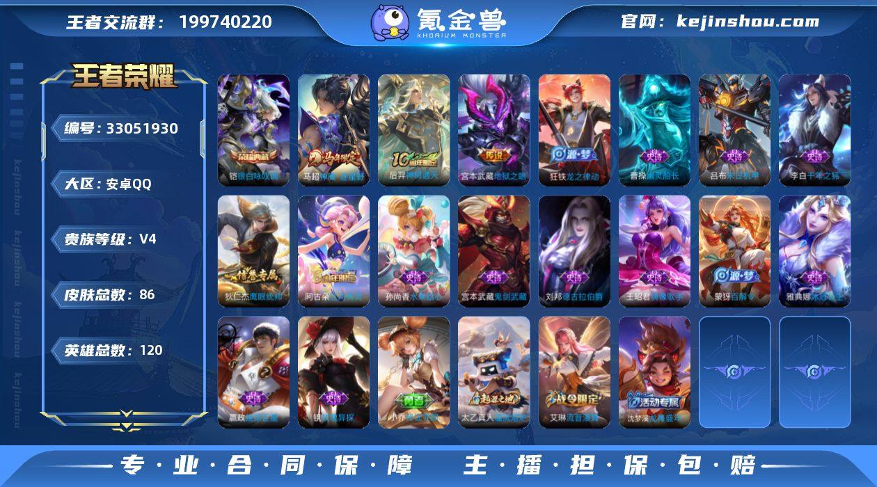 -V4-荣耀王者-120英雄-86皮肤-1典藏-3传说-18史诗 【稀有英雄】 不知火舞 橘右京 夏洛特 娜可露露 韩信 艾琳 赵云 【典藏皮肤】 银白咏叹调 【传说皮肤】 神骥·逐星野 地狱之眼 神树通天 【限定皮肤】 赏金猎手 地狱之眼 【史诗皮肤】 末日机甲 百解令 德古拉伯爵 鬼剑武藏 龙之律动 地狱燃心 摇滚巨星 偶像歌手 赏金猎手 鹰眼统帅 玫瑰异探 李小龙 冰冠公主 冰雪圆舞曲 千年之狐 水果甜心 江河有灵 幽灵船长 【勇者皮肤】 暖冬絮语 纽约教父 大发明家 龙舞盛年 汉昭烈帝 黄金武士 阴阳师 古海寻踪 功夫老勺 海滩派对 完美运算 红桃皇后 野性能量 天穹祈灯 决胜大满贯 死亡骑士 忍·炎影 擒涛扼浪 天使之翼 玩趣恶龙 兔女郎 流音漫舞 幻夜行动 未来纪元 万象初新 时尚教父 秘密基地 少女阿狸 白执事 谧流熔炉 玫蓝誓约 【其他皮肤】 前尘 圣殿之光 芝加哥教父 潮流仙人 龙域领主 超能战警 花见巫女 灼热之刃 海之征途 冰刃幻境 碧珀绯影 魇语军师 范海辛 激情绿茵 幸存者 荷鲁斯之眼 绝影神枪 孤猎 秩序猎龙将 地府判官