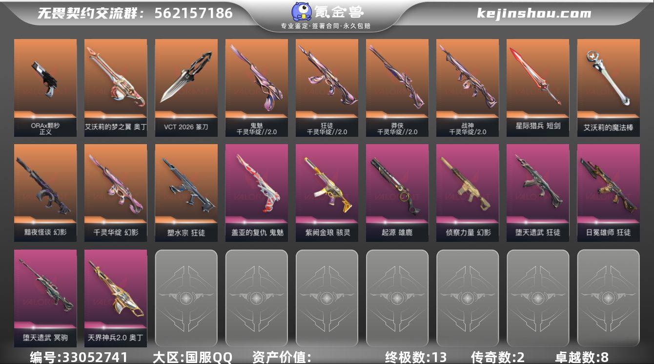 【947874】【套装】:VCT 2026 赛季套装,千灵华绽//2.0套装 【英雄】:幻棱,炼狱,维斯,暮蝶,壹决,铁臂,捷风,雷兹,不死鸟,贤者,猎枭,蝰蛇,零,芮娜,尚勃勒,霓虹,斯凯,夜露,星礈,K/O,盖可,黑梦,钢锁 【近战武器】:近战武器-VCT 2026 篆刀,近战武器-流风回雪,近战武器-艾沃莉的魔法棒,近战武器-星际猎兵 短剑 【狂徒】:狂徒-塑水宗,狂徒-千灵华绽//2.0,狂徒-堕天遗武,狂徒-日冕雄师 【幻影】:幻影-黯夜怪谈,幻影-千灵华绽,幻影-侦察力量 【冥驹】:冥驹-堕天遗武 【莽侠】:莽侠-千灵华绽//2.0 【战神】:战神-千灵华绽//2.0 【奥丁】:奥丁-艾沃莉的梦之翼,奥丁-天界神兵//2.0 【雄鹿】:雄鹿-起源 【骇灵】:骇灵-紫阙金琅,骇灵-无限竞技 【正义】:正义-ORA x 颗秒 【鬼魅】:鬼魅-千灵华绽//2.0,鬼魅-盖亚的复仇 【卡面】:无畏契约:暮蝶 卡面,热舞环节 卡面,Clutch 卡面,无畏契约GO!第一卷:芮娜 卡面,无畏契约GO!第一卷:零 卡面,无畏契约GO!第一卷:贤者 卡面,纪念照 P2 卡面,别冒尖 卡面,黑影先生的咖啡! 卡面,代号红色 卡面,新兵报到 卡面,V契约 卡面,无畏契约 卡面 【喷漆】:伤心心 喷漆,审判之爪 喷漆,买装...