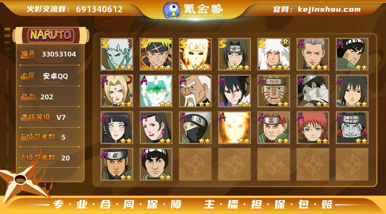 【新手福利号】y7449 战力202w 5s 20a 25忍法帖已开61级 侠隐佐助 忍战卡卡西 妖怪纲手 58片黄猿