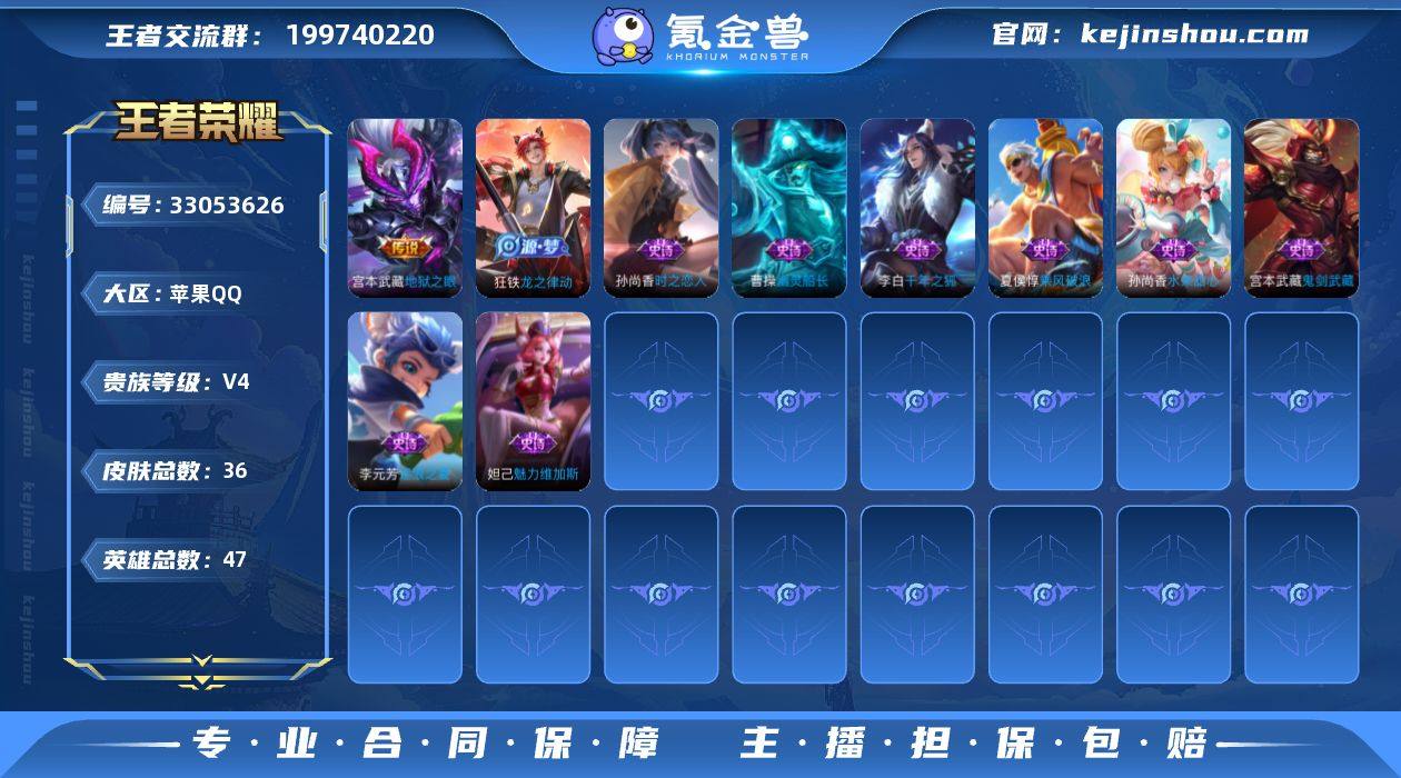 雄 36皮肤 可修改实名 【稀有英雄】大司命,娜可露露(鸟人),橘右京(橘子) 【传说皮】地狱之眼,澜逐花归海,神骥·越千峰 【史诗皮】鬼剑武藏,时之恋人-孙尚香,水果甜心,乘风破浪,千年之狐,逐浪之夏,线条小狗-小乔,幽灵船长,魅力维加斯,线条小狗-周瑜,龙之律动,光弋星穹 【普通皮】极光幻客,沉稳之力,忍·炎影,荷鲁斯之眼,范海辛,海滩派对,玩偶对对碰,阿尔法小队,孤猎,龙舞盛年,往忆晖光,万事如意,百相守梦-影,埃及法老,溯影追猎,荣光之誓,死亡骑士,雪境奇遇-西施,赤焰之缨,红桃皇后,西部大镖客-孙悟空