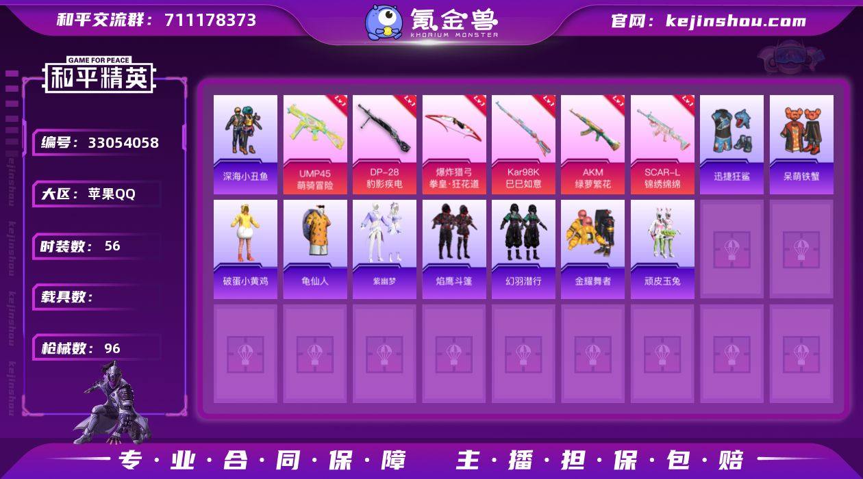 DYH18082苹果手Q-1粉装-7特效枪-56套装-96枪皮-6王牌印记-超级王牌-27367热力值 【1粉装】角色-智耀战神 【7特效枪】爆炸猎弓-拳皇·狂花道[4级],SCAR-L-锦绣绵绵[5级],AKM-绿萝繁花[5级],UMP45-萌骑冒险[5级],Mk14-福马献瑞[4级],DP-28-豹影疾电[5级],Kar98K-巳巳如意[5级] 【5稀有】深海小丑鱼,小丑鱼,AKM-奇异狩猎者,M762-奇异狩猎者,AKM-缤纷海域 【3飞行器】鸡智如我飞行器,空岛之星尾迹,破刃行动尾迹 【1背包】深海小丑鱼背包 【139其它衣服和枪皮】金耀舞者,角色-碧青流霞,狙击之神,龟仙人,薄荷星砂,迅捷狂鲨,破蛋小黄鸡,锦衣飞扬,春光漫游,青涩时光,缤纷果语,红釉青花,龙的传人,竞技名士,完美偶像,紫幽梦,惊鸿侠骨,SS27特训,快闪甜心,萌鸡速递,老实芭蕉,SS37特训,蓝冰羽,云霞荷露,鱼渊荷华,SS32特训,SS28特训,SS35特训,呆萌铁蟹,恋语绒绒,空岛之星,角色-糖霜甜心,海盐绵绵冰,SS26特训,顶瓜瓜,雨过天青,焰鹰斗篷,SS34特训,燕燕于飞,福马献瑞,SS25特训,活力之心,SS31特训,SS36特训,柠萌假日,顽皮玉兔,SS33特训,沙漠毒蛇,幻羽潜行,长空猛禽,大橘大利,战术大师,马上有钱,S1897-紫幽梦,MG3-霓彩脉冲,AA12-G-雨过天青,S12K-霓彩脉冲,UZI-冰河战士,沙漠之鹰-未来领航者,平底锅...