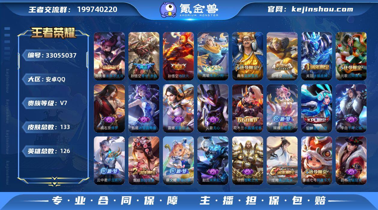 实名: 可修改 性别: 男号 贵族等级: V7 英雄数: 126 皮肤数: 133 荣耀水晶: 杀手不太冷 传说皮: 地狱火,零号·赤焰 限定皮: 冰锋战神,游园惊梦,逐梦之音,高山流水,孙行者 亮点: 【优质装备】:杀手不太冷,地狱火,零号·赤焰