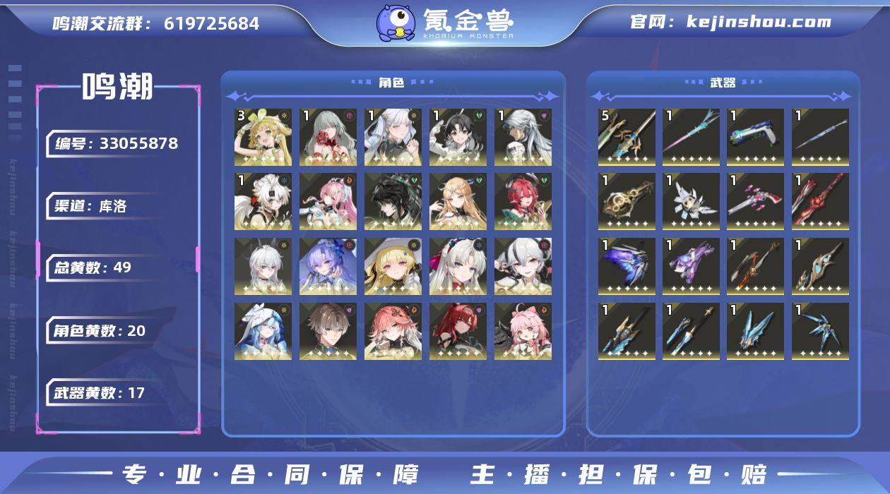 男/女主: 男主 总黄数: 49 联觉等级: 80 拥有五星共鸣者: 鉴心,卡卡罗,安可,维里奈,凌阳,吟霖,今汐,长离,相里要,守岸人,椿,珂莱塔,菲比,坎特蕾拉,赞妮,夏空,卡提希娅,弗洛洛,仇远,爱弥斯 3鸣五星共鸣者: 3鸣维里奈 1鸣五星共鸣者: 1鸣鉴心,1鸣卡卡罗,1鸣凌阳,1鸣今汐,1鸣弗洛洛 0鸣五星共鸣者: 0鸣安可,0鸣吟霖,0鸣长离,0鸣相里要,0鸣守岸人,0鸣椿,0鸣珂莱塔,0鸣菲比,0鸣坎特蕾拉,0鸣赞妮,0鸣夏空,0鸣卡提希娅,0鸣仇远,0鸣爱弥斯 拥有五星武器: 浩境粼光,千古洑流,擎渊怒涛,漪澜浮录,时和岁稔,赫奕流明,诸方玄枢,星序协响,裁春,死与舞,和光回唱,血誓盟约,焰光裁定,不屈命定之冠,相位涟漪,永远的启明星 5鸣五星武器: 5鸣血誓盟约 1鸣五星武器: 1鸣浩境粼光,1鸣千古洑流,1鸣擎渊怒涛,1鸣漪澜浮录,1鸣时和岁稔,1鸣赫奕流明,1鸣诸方玄枢,1鸣星序协响,1鸣裁春,1鸣死与舞,1鸣和光回唱,1鸣焰光裁定,1鸣不屈命定之冠,1鸣相位涟漪,1鸣永远的启明星 亮点: 【MC196】80级/49黄/男主/20个五星角色/17个五星武器未绑定,爱弥斯,仇远,弗洛洛,卡提希娅,赞妮,夏空,坎特蕾拉,菲比,珂莱塔,椿,守岸人,相里要,长离,今汐,吟霖,维里奈,鉴心,卡卡罗,安可,凌阳,永远的启明星,相位涟漪,不屈命定之冠,焰光...