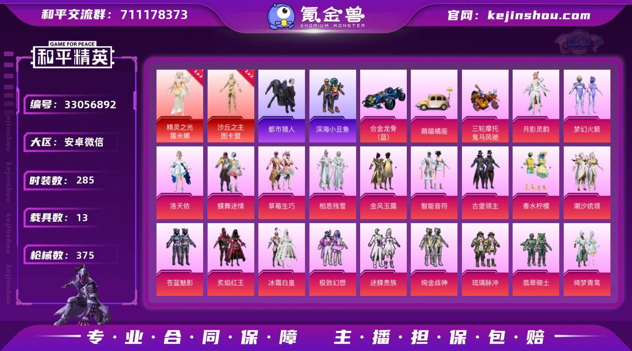 【2红装4级图卡盟战神框都市男神小熊背包14载具30粉装19特效枪素材号】 安卓V区-153167热力值-历史最高段位:无敌战神-285套装-375枪皮 【2红装】 沙丘之主-图卡盟(4级) 精灵之光-露米娜(1级)【14载具】 玛莎拉蒂粉色 玛莎拉蒂M白色 路特斯EL蓝色 路特斯EV黄色 兰博SVJ绿色 阿斯顿马丁S红色 阿斯顿马丁X橙色 特斯拉R水滴蓝 合金龙骨蓝色 萌喵橘座 特斯拉3白色 空客蔚蓝之翼僚机 双刃魅影绿色 鬼马风驰【4稀有】 都市猎人 萌熊伴侣背包(小熊背包) 百万伏待背包(猫包) 奇异狩猎者【30粉装】 梦幻火箭 洛天依 琉璃脉冲 绚金战神 沙场疾风 蜜桃特工 极致幻想 草莓生巧 香水柠檬 冰霜白皇 绮梦青鸾 暗夜玫瑰 蓝莓炮弹 蝶舞迷情 筑梦精灵 炙焰红王 相思残雪 甜梦冰蝶 紫电风暴 赤焰黑爵 冷魅冰骑 吟月归客 金风玉露 智能音符 古堡领主 潮汐统领 迷蝶贵族 苍蓝魅影 翡翠骑士 角色-月影灵韵【19特效枪】 UMP45-宇宙意志(3级) GROZA-精灵之光(3级) P90-沙丘之主(3级) M416-心之恋语(7级) AKM-炫紫旋律(7级) ACE32-萌骑漫游(1级) SCAR-L-青春物语(1级) DP-28-枪炮玫瑰(4级) SCAR-L-梦幻火箭(7级) GROZA-香水柠檬(1级) M762-激战未来(4级) UZI-绮梦青鸾(4级) UMP45-相思残雪(5级) UZI-...