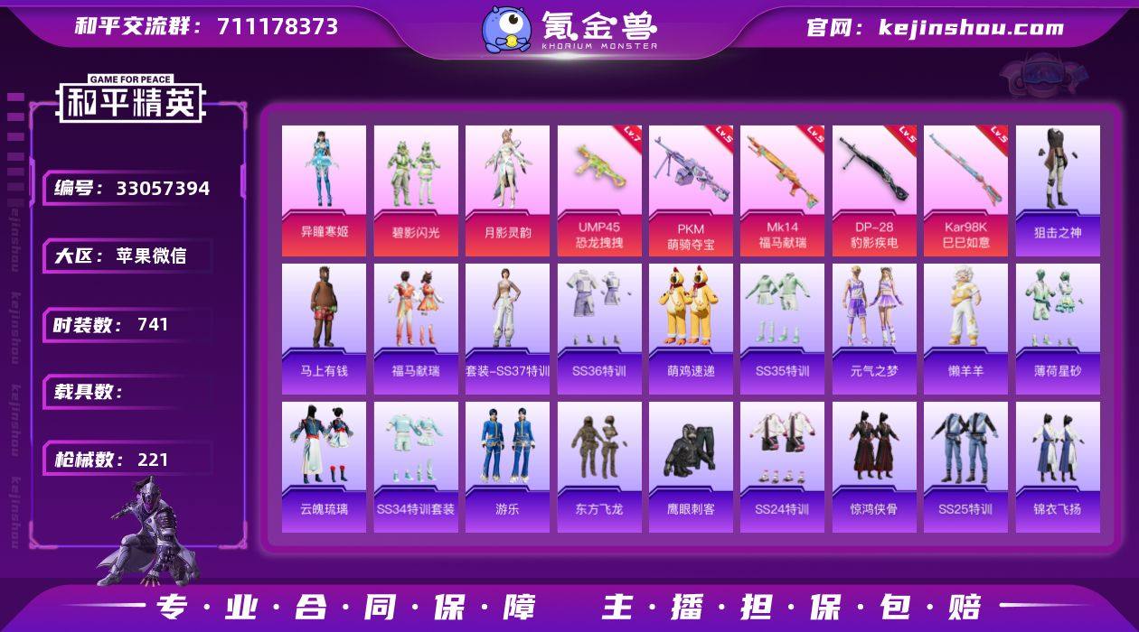 实名: 可修改 时装数: 741 枪械数: 221 战备数: 170 热门装扮: 鹰眼刺客,东方飞龙,碧影闪光,月影灵韵,异瞳寒姬 稀有枪皮: UMP45恐龙拽拽,Kar98K-巳巳如意,DP-28-豹影疾电,PKM-萌骑夺宝