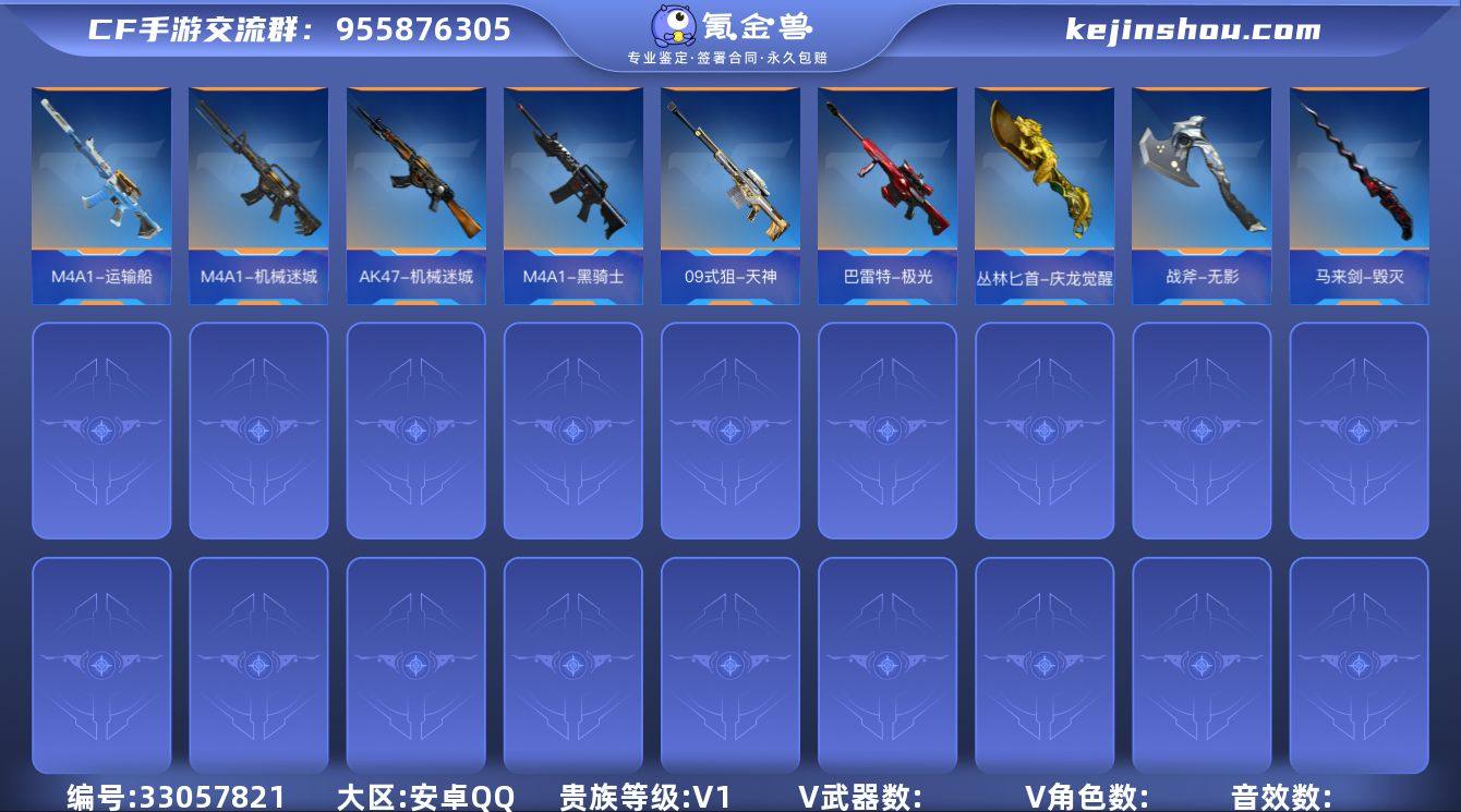 实名: 可修改 贵族等级: V1 v武器: M4A1-机械迷城,AK47-机械迷城,M4A1-黑骑士,09式狙-天神,巴雷特-极光,战斧-无影,马来剑-毁灭,M4A1-运输船,丛林匕首-庆龙觉醒,打击者-天神,AK47-木兰