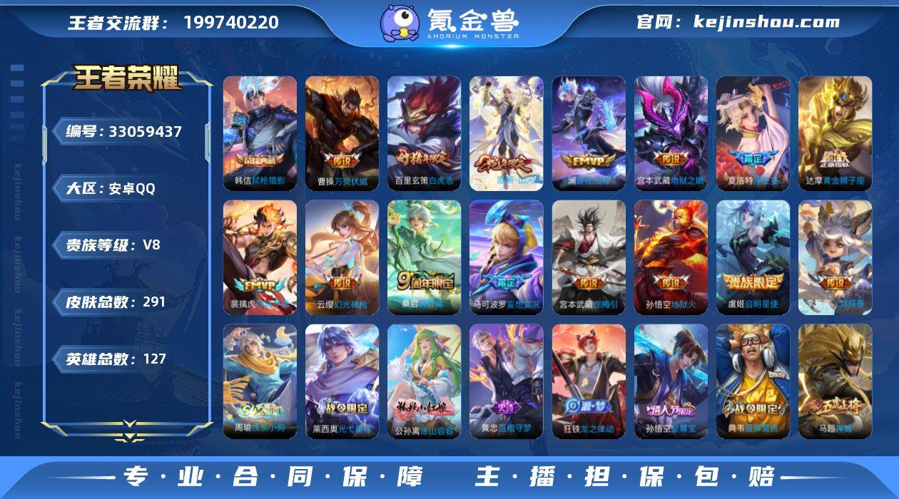 安卓Q-V8-永恒钻石II段位-127英雄-291皮肤-1典藏皮肤-15传说-78史诗【英雄全皮】:百里玄策全皮,夏洛特全皮,司空震全皮【荣耀典藏】:韩信弑枪猎影【传说皮肤】:曹操万灵伏威,司空震愿照山河定,云缨幻光神枪,裴擒虎祥瑞亨通,桑启鸣野蒿,澜逐花归海,宫本武藏惊梅引,马可波罗妄想实况,夏洛特浮生妄,李元芳飞鸢探春,虞姬启明星使,达摩黄金狮子座,百里玄策白虎志,宫本武藏地狱之眼,孙悟空地狱火【限定皮肤】:白起狰,姜子牙天穹之誓,狄仁杰阴阳师,赵云皇家上将,赵云龙胆,嬴政优雅恋人,嬴政白昼王子,孙尚香蔷薇恋人,鲁班七号狮舞东方,庄周高山流水,高渐离死亡摇滚,芈月重明,吕布猎兽之王,周瑜赤莲之焰,元歌云间偶戏,夏侯惇朔风刀,甄姬游园惊梦,曹操烛龙,典韦穷奇,典韦蓝屏警告,马可波罗暗影游猎,马可波罗妄想实况,狄仁杰魔术师,狄仁杰万华元夜,达摩沙漠行僧,项羽海滩派对,老夫子醍醐杖,程咬金演武夺筹,兰陵王驯魔猎人,兰陵王金庭之子,亚瑟潮玩骑士王,孙悟空至尊宝,牛魔御旌,李元芳云中旅人,虞姬启明星使,钟馗神迹守卫,钟馗驱傩正仪,杨玉环遇见飞天,女娲朔望之晖,雅典娜单词大作战,雅典娜黎明之约,太乙真人饕餮,鬼谷子...
