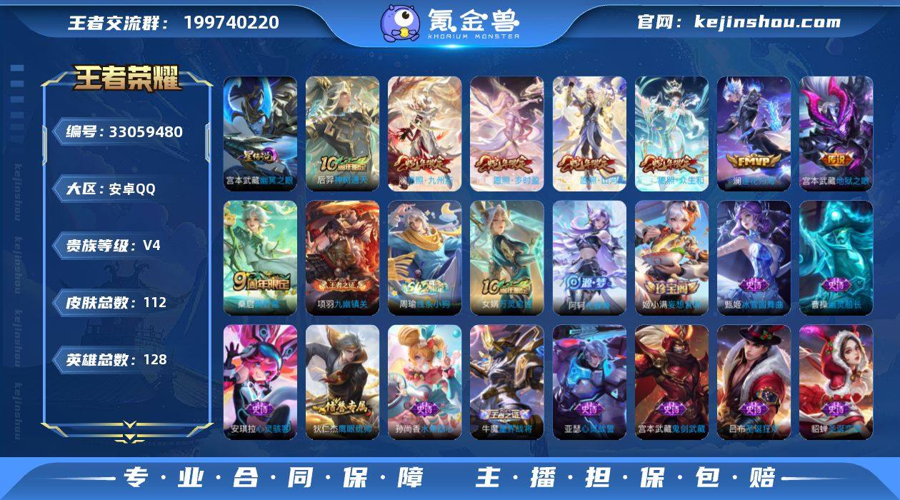 安卓Q-V4-最强王者段位-128英雄-112皮肤-8传说-22史诗【英雄全皮】:敖隐全皮【传说皮肤】:后羿神树通天,司空震愿照山河定,妲己愿照众生和,澜愿照九州拓,虞姬愿照岁时盈,桑启鸣野蒿,澜逐花归海,宫本武藏地狱之眼【限定皮肤】:蒙犽顽岩魄,姜子牙天穹之誓,狄仁杰阴阳师,赵云皇家上将,项羽海滩派对,百里玄策原初追逐者,裴擒虎擒涛扼浪,鲁班大师探海日志,鬼谷子天穹祈灯,姬小满妄想食味,沈梦溪龙舞盛年,刘邦剑破天穹,程咬金群星魔术团,周瑜熔金海岸【年限皮肤】:司空震愿照山河定,妲己愿照众生和,澜愿照九州拓,虞姬愿照岁时盈【赛季限定】:裴擒虎擒涛扼浪,鲁班大师探海日志,鬼谷子天穹祈灯,刘邦剑破天穹,姜子牙天穹之誓,东皇太一噬灭天穹,太乙真人谧流熔炉,钟馗虚灵犬护,甄姬逆浪荇歌,亚瑟荣光之誓,百里玄策原初追逐者,牛魔星界战将,项羽九幽镇关【战令限定】:周瑜线条小狗【史诗皮肤】:周瑜线条小狗,项羽九幽镇关,女娲万灵启世,阿轲化蝶舞,牛魔星界战将,蒙犽顽岩魄,姬小满妄想食味,百里玄策原初追逐者,狄仁杰鹰眼统帅,李元芳逐浪之夏,刘禅天才门将,蔡文姬舞动绿茵,安琪拉心灵骇客,雅典娜冰冠公主,亚瑟心灵战警,曹操幽灵...