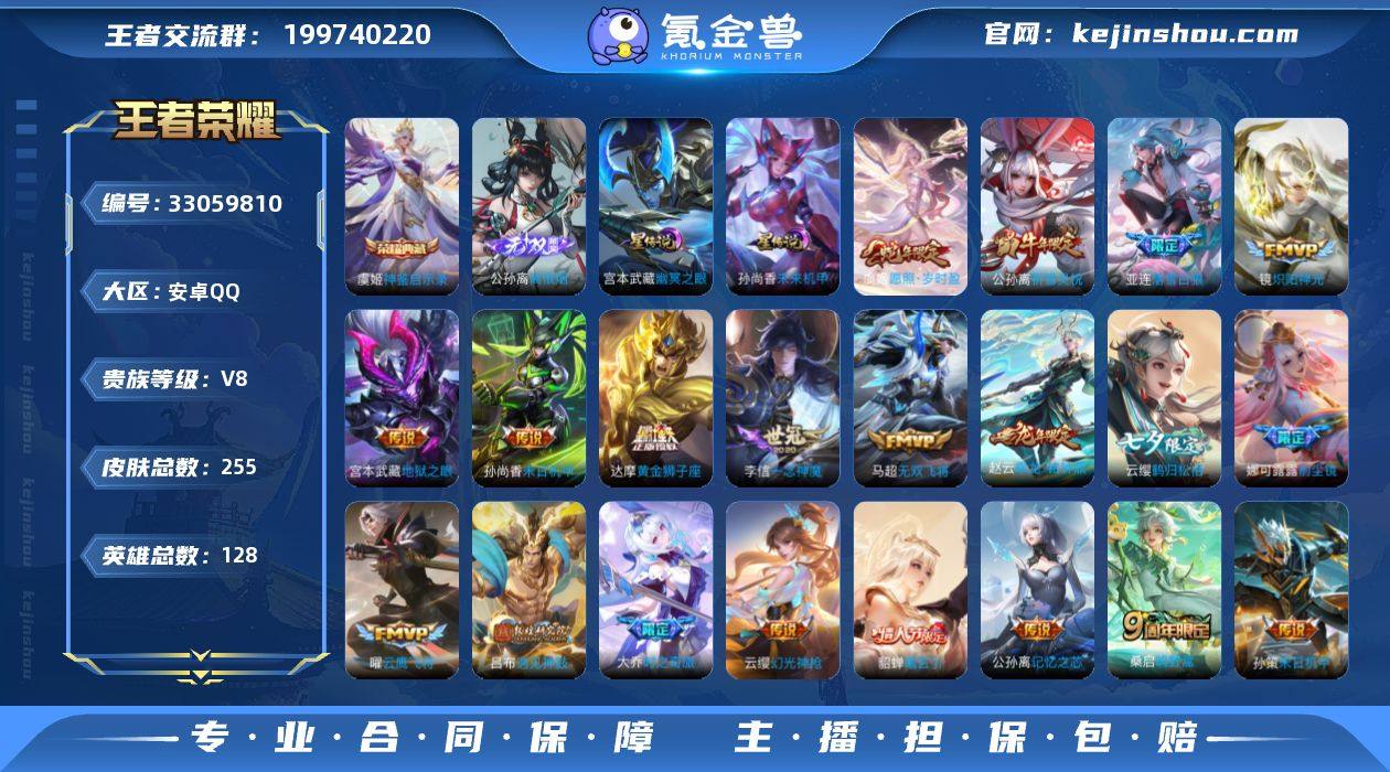 安卓Q-V8-永恒钻石V段位-128英雄-255皮肤-1典藏皮肤-1无双-28传说-72史诗【英雄全皮】:娜可露露全皮,空空儿全皮,影全皮【荣耀典藏】:虞姬神鉴启示录【无双皮肤】:公孙离离恨烟【传说皮肤】:虞姬愿照岁时盈,云缨幻光神枪,桑启鸣野蒿,亚连落雪白狼,貂蝉曦玄引,赵云乘龙铭钟鼎,大乔时之奇旅,兰陵王影龙天霄,吕布遇见神鼓,云缨鹤归松栖,公孙离记忆之芯,王昭君星穹之声,百里守约碎云,娜可露露前尘镜,马超无双飞将,孙策末日机甲,公孙离祈雪灵祝,铠绛天战甲,镜炽阳神光,虞姬启明星使,曜云鹰飞将,李信一念神魔,刘备时之恋人,貂蝉猫影幻舞,达摩黄金狮子座,花木兰冠军飞将,孙尚香末日机甲,宫本武藏地狱之眼 幽冥之眼 未来机甲 【限定皮肤】:公孙离离恨烟,暃埋骨钱,蒙犽顽岩魄,蔡文姬夏日便利店,虞姬夏日便利店,姜子牙天穹之誓,狄仁杰阴阳师,赵云皇家上将,孙尚香蔷薇恋人,吕布遇见神鼓,元歌云间偶戏,元歌无心,夏侯惇朔风刀,马可波罗山海玄木吟,狄仁杰魔术师,达摩沙漠行僧,项羽海滩派对,王昭君星穹之声,兰陵王影龙天霄,兰陵王金庭之子,娜可露露前尘镜,亚瑟潮玩骑士王,孙悟空至尊宝,李元芳云中旅人,虞姬启明星使,杨玉环遇见飞...