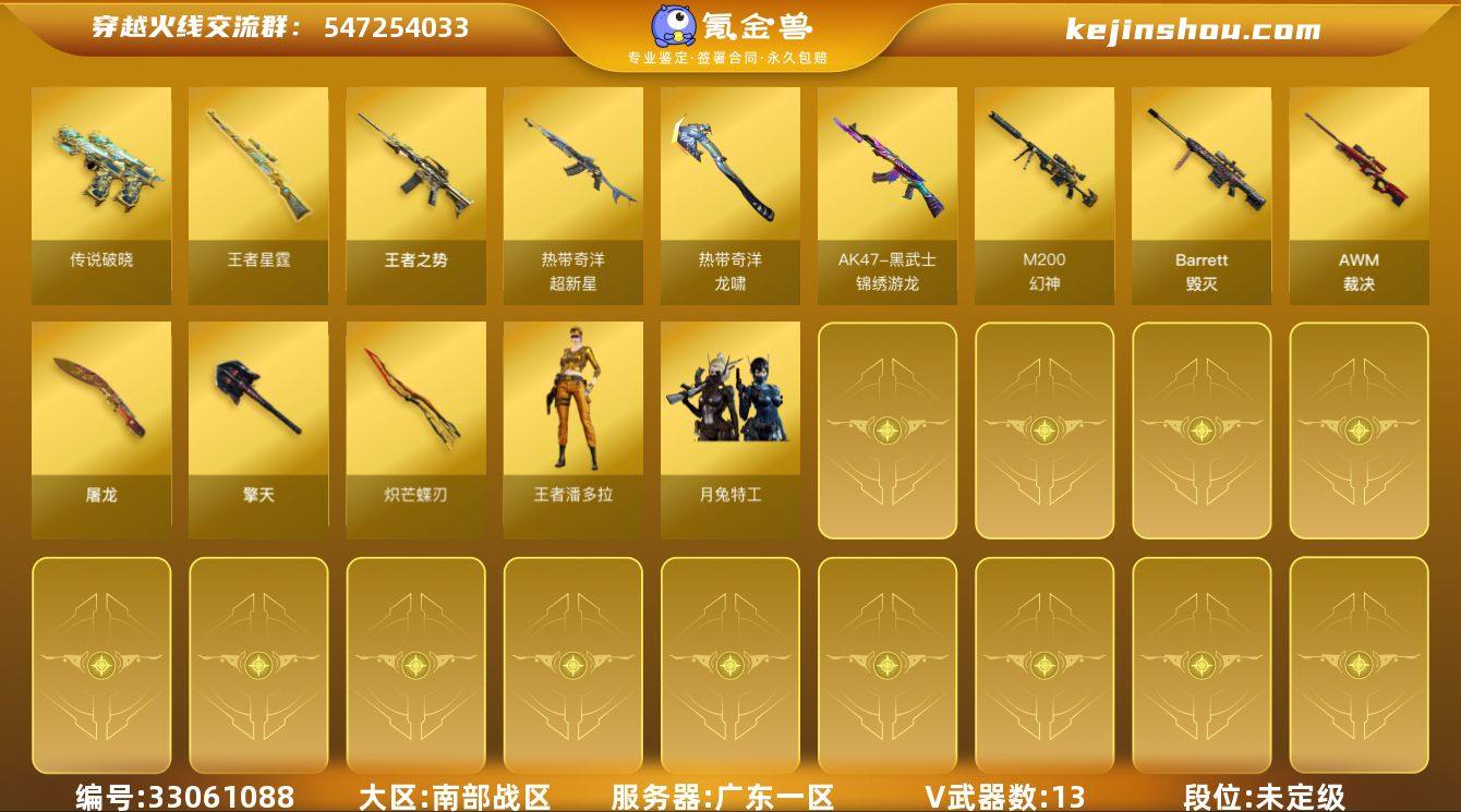 广东一区-12V-3王者武器数-0炫金武器数 【传说武器】:传说破晓 【热门武器】:传说破晓,M200-幻神,炽芒蝶刃 【王者炫金武器】:王者之势,王者星霆 【皮肤】:幻神-电流骇客 皮肤 【角色】:月兔特工,王者潘多拉,奇洋探员,暗夜-X,飞虎队-X,风暴女,猎狐者-追月,龙儿,蛇姬,维纳斯,雪莉杨,夜玫瑰-宠粉,樱-战斗天使,影武者-X,游珑儿 【英雄级武器】:黑武士-锦绣游龙,超新星-热带奇洋,白虎之魄-觉醒版,Barrett-毁灭,AWM-裁决,M200-幻神,屠龙*2,擎天*2,炽芒蝶刃,龙啸-热带奇洋,手雷-热带奇洋 【源级武器】:源·火麒麟,源-黑龙,源·雷神,魂·M4A1-雷神-化蛇,魂·雷神-新春神龙,魂·黑骑士-现代金属,魂·黑骑士-娜塔莉娅,御·黑骑士·哪吒闹海,源·无影,魂-死神-机甲核心,源·天启,魂·HK417-朱雀-凤灵,灵·HK417-朱雀-甜蜜火力,源-极光,源·天龙,魂·裁决-凤灵,魂·裁决-新人王绿豆,魂·毁灭-航天科技,魂·毁灭-秦师,御·毁灭-黑大圣,源·Barrett-朱雀,魂·修罗-神兵利器,源·天神,魂·天神-阿努比斯,魂·天神-维纳斯,魂·天神-宇航兔兔,源·武圣glock,源·擎天-萌杀 【道具】:泡泡象背包,奇洋探员-海龟背包,热带奇洋炫彩背包,黄金魔花研究所背包...