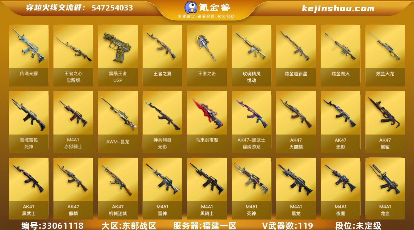 移动专区-131V-11王者武器数-4炫金武器数 【传说武器】:传说光耀 【热门武器】:传说光耀,QBZ03-金色蔷薇,Scar Light-白虎,M200-幻神,死亡之眼,M4A1-黑骑士*2,汤姆逊-烈龙*6,RPK-盘龙*6,加特林-炼狱,沙鹰-修罗*4,金刚伞 【王者炫金武器】:王者之翼,玫瑰精灵-悦动,USP-雷暴王者,王者之击,炫金超新星,炫金毁灭,炫金天龙*2 【音效卡】:AK47-火麒麟音效卡,M4A1-雷神音效卡,M4A1-黑骑士音效卡,Barrett-毁灭音效卡,死神-雪域霜狐-怀旧音效卡,AWM-昌龙-怀旧音效卡*2 【皮肤】:幻神-电竞之星 皮肤,雷神-暗月,雷神-能量核心*2,雷神-星空,雷神-传奇N9,雷神-脉冲核心,雷神-蓝风铃 皮肤,火麒麟-雷神,火麒麟-心动糖果,毁灭-暗月,毁灭-星空,毁灭-虹光风暴 皮肤,毁灭-英雄计划 皮肤,黑龙-能量核心*2,M4A1-黑龙-361,黑骑士-暗月,黑骑士耀金皮肤,无影-暗月*2,无影耀金皮肤,AK47-黑武士-361,天启-暗月,天龙-秘银,天龙-能量核心,AWM-天龙-传奇白鲨,极光-能量核心,修罗-能量核心*3,天神-暗月 【角色】:魅影,凌霄,审判者,战地猎狐,王者-瞳-闭月羞花,王者春,王者玲珑,堕落女神,雪域霜狐,幻面灵狐,风暴女,嘉年华灵狐,兰-新年限定,...