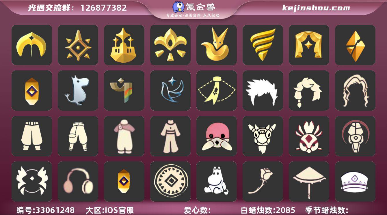 [17746735]账号类型: 手机账号 季节已毕业: 圣岛季,预言季,梦想季,小王子季,潜海季,表演季,破晓季,集结季,追忆季,姆明季,彩染季,青鸟季 完成地图: 晨岛,云野,雨林,霞谷,暮土,禁阁 珍稀物品: 鳐鲲斗篷,阿努比斯(狗头),白枭,玫瑰花 礼包: 鹿角,秋千,白绒金,瑞雪,跷跷板,小船,橘子,创始人 裤子: 武士裤,背带裤,搓澡巾,妮妮裙子,王子服 面具: 阿努比斯,凤凰面具,呼吸面具,黄眉企鹅面具,辉光羚羊面具 面饰: 红耳机,青鸟毕业面饰 项链: 围巾 发型: 若笠,虚荣,单侧绑发,小王子发型 头饰: 行军锅头盔,蓝色音乐会,平顶帽 斗篷: 海洋斗,蟑螂斗,遥鲲斗篷,黄色连帽披风,燕尾斗篷,冥龙斗篷,领主红斗篷,瑞雪斗篷,彩染围巾斗篷,青鸟毕业斗篷 配饰: 雨伞,姆明抱枕,小红伞,玫瑰花,圆鼓,蓝色手碟,鲲灯 亮点: 【优质装备】:预言季,阿努比斯(狗头),表演季,白枭(帝企鹅发),武士裤,圣岛季,梦想季,小王子季(王子季),潜海季,破晓季,鳐鲲斗篷,行军锅头盔(六边锅帽子)(双耳锅帽子),集结季,玫瑰花,追忆季,妮妮裙子(妮妮长裙),姆明抱枕,小红伞(姆明红伞)(姆明大伞),王子服(小王子套装),蟑螂斗(凤凰斗篷),围巾(肩带),姆明季,凤凰面具,呼吸面具(潜水面具),黄眉企鹅面具,单侧绑发(单边小辫),小王子发型,遥鲲...