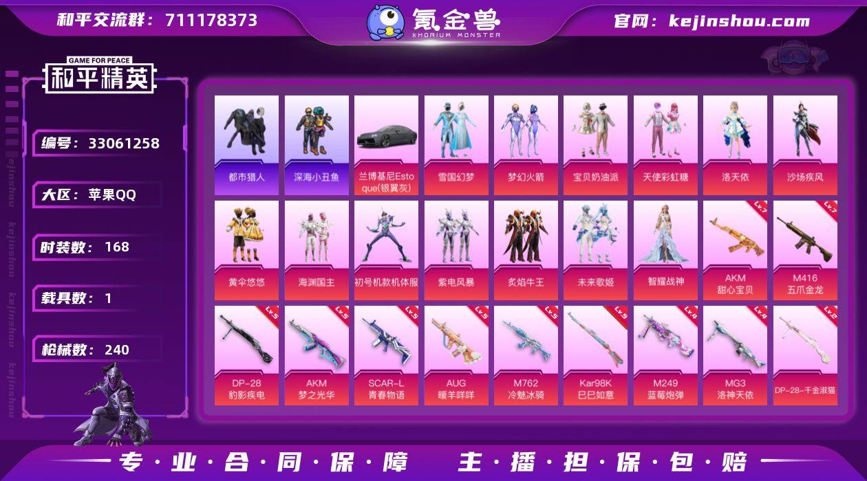 【AZH3502】苹果 手Q【雪国都市紫螳螂梦幻火箭 满级甜心宝贝AKM 五爪金龙M416 1载具】13粉装-17特效枪-1载具-5粉色飞行器-83173热力值-18王牌印记-168套装-240枪皮 【热门品类】:粉装-雪国幻梦,粉装-梦幻火箭,套装-浪漫天命,套装-都市猎人,套装-深海小丑鱼,套装-暗影哥特,套装-粉红小猪 【粉色套装】:粉装-宝贝奶油派,粉装-天使彩虹糖,粉装-雪国幻梦,粉装-梦幻火箭,角色-洛天依,粉装-沙场疾风,粉装-黄伞悠悠,粉装-海渊国主,角色-初号机款机体服,粉装-紫电风暴,粉装-炙焰牛王,粉装-未来歌姬,角色-智耀战神 【粉色枪皮等级】:AKM-甜心宝贝(七级),AKM-梦之光华(五级),SCAR-L-青春物语(五级),M416-五爪金龙(七级),M416-风花雪月(一级),AUG-暖羊咩咩(五级),M762-冷魅冰骑(五级),ACE32-萌骑漫游(四级),AKS-74U-森灵之息(四级),P90-诸神·破晓(一级),Kar98K-巳巳如意(五级),Mk14-福马献瑞(五级),M249-蓝莓炮弹(四级),DP-28-千金淑猫(二级),DP-28-豹影疾电(五级),MG3-洛神天依(四级) 【粉色载具】:兰博基尼Estoque(银翼灰) 【粉色枪皮】:AKM-甜心宝贝,AKM-梦之光华,SCAR-L-青春物语,M416-五爪金龙,M416-风花雪月,AUG-暖羊咩咩,M762-冷魅...