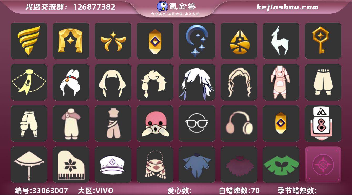 账号类型: 手机账号 季节已毕业: 潜海季,表演季,欧若拉季,夜行季,追忆季,归巢季,九色鹿季,筑巢季 完成地图: 晨岛,云野,雨林,霞谷,暮土,禁阁 珍稀物品: 白枭,透明蝶翼斗,彩虹围巾 礼包: 鹿角,橘子,贝壳,兔子,雪花,四叶草 裤子: 武士裤,背带裤,搓澡巾,蓝绿裤,筑巢季·裤子 面具: 呼吸面具,夜行毕业面具,黄眉企鹅面具 面饰: 红耳机,黑框眼镜 项链: 围巾 发型: 归巢毕业发型,若笠,虚荣,单侧绑发,留辫蘑菇头,飞天盘发 头饰: 蓝色音乐会,平顶帽 斗篷: 海洋斗,绿芽,粉红绒毛斗篷,燕尾斗篷,领主红斗篷 配饰: 雨伞,筑巢季·小手办,高音钢琴,相机,鲲灯 亮点: 【优质装备】:表演季,白枭(帝企鹅发),武士裤,潜海季,透明蝶翼斗,欧若拉季(欧若拉),归巢毕业发型(五塑彩羽发),筑巢季·小手办(光之子试衣),高音钢琴(白色高脚钢琴),夜行季,追忆季,相机(季卡相机),彩虹围巾(五塑彩带斗),归巢季,九色鹿(九色鹿季),蓝绿裤(高领舞服),围巾(肩带),筑巢季,筑巢季·裤子(设计师长袍),呼吸面具(潜水面具),夜行毕业面具(棕熊面具),黄眉企鹅面具,黑框眼镜(粗框眼镜),单侧绑发(单边小辫),留辫蘑菇头,粉红绒毛斗篷(绒毛斗篷),燕尾斗篷,领主红斗篷(暗红斗篷),鲲灯(追忆之书),飞天盘发(九色鹿丸子头),红耳机,鹿角(圣...