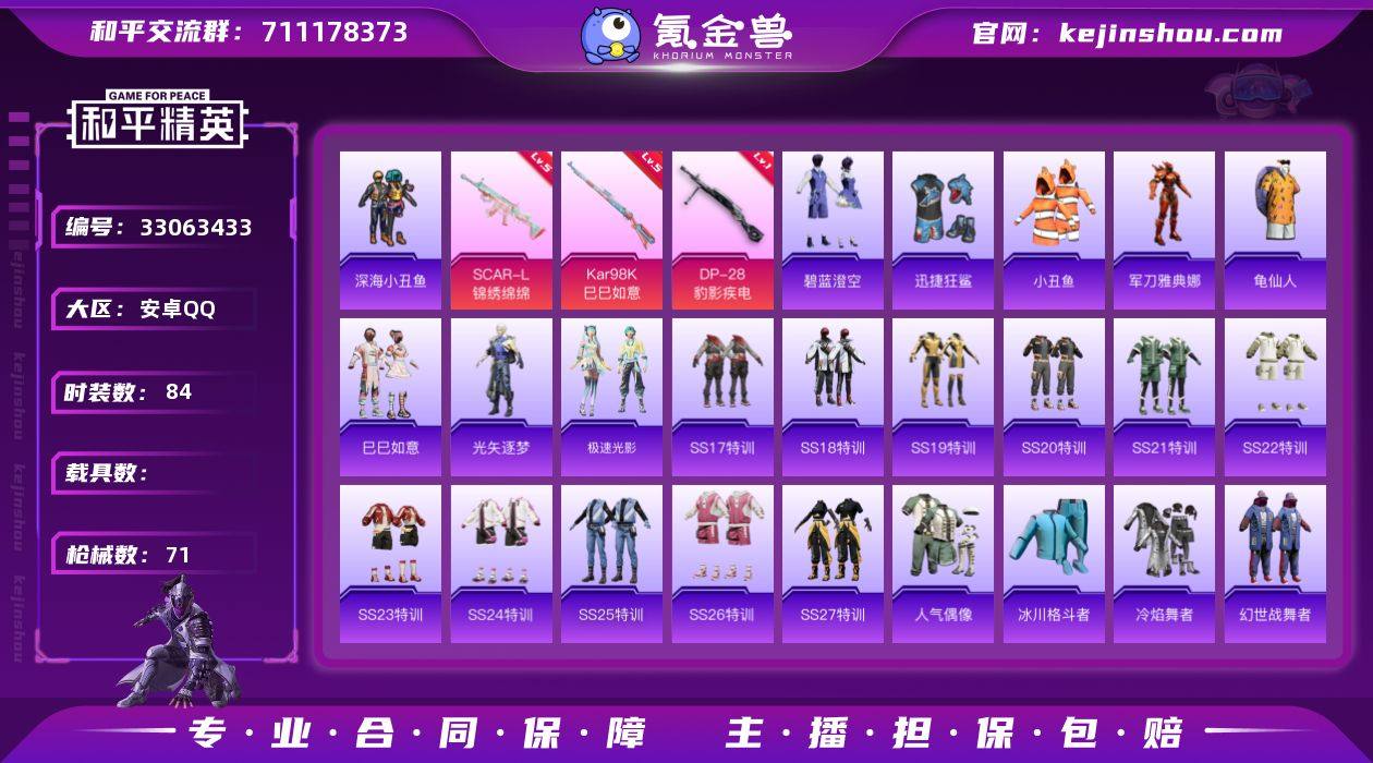 安卓 手Q-1粉装-3特效枪-0载具-0粉色飞行器-22527热力值-1王牌印记-84套装-71枪皮 【热门品类】:套装-深海小丑鱼,套装-小丑鱼,角色-军刀雅典娜,套装-龟仙人 【粉色套装】:粉装-碧蓝澄空 【粉色枪皮等级】:SCAR-L-锦绣绵绵(五级),Kar98K-巳巳如意(五级),DP-28-豹影疾电(一级) 【粉色枪皮】:SCAR-L-锦绣绵绵,Kar98K-巳巳如意,DP-28-豹影疾电 【粉色降落伞】:彩虹甜喵降落伞,旋转彩虹降落伞,第五大道降落伞,圣堂之誓降落伞,精灵梦叶罗丽降落伞 【稀有套装】:套装-龟仙人,套装-巳巳如意,角色-光矢逐梦,套装-极速光影 【稀有枪皮】:AKM-破晓战魂,M16A4-幻世战舞者,SCAR-L-炫彩节奏,SCAR-L-玉兔迎春,SCAR-L-红色方程式,M416-夜灯,M416-糯团青竹,M416-红色方程式,M416-绯红前夜,M416-蓝色火焰,GROZA-懵萌河马,AUG-耀粉歌者,QBZ-彩虹符号,M762-天降萌叽,M762-奇异狩猎者,M762-绯红前夜,G36C-懵萌河马,AC-VAL-天降萌叽,AC-VAL-快闪甜心,蜜獾-娇憨猪猪,UZI-啾咪啾咪,UZI-娇憨猪猪,UZI-幻影战神,UMP45-涂山之恋,UMP45-生命誓言,UMP45-蓝色火焰,Vector-彩虹符号,汤姆逊-奇异狩猎者,汤姆逊-炫彩节奏,P90-快闪甜心,P90-巳巳如意,M24-奇...