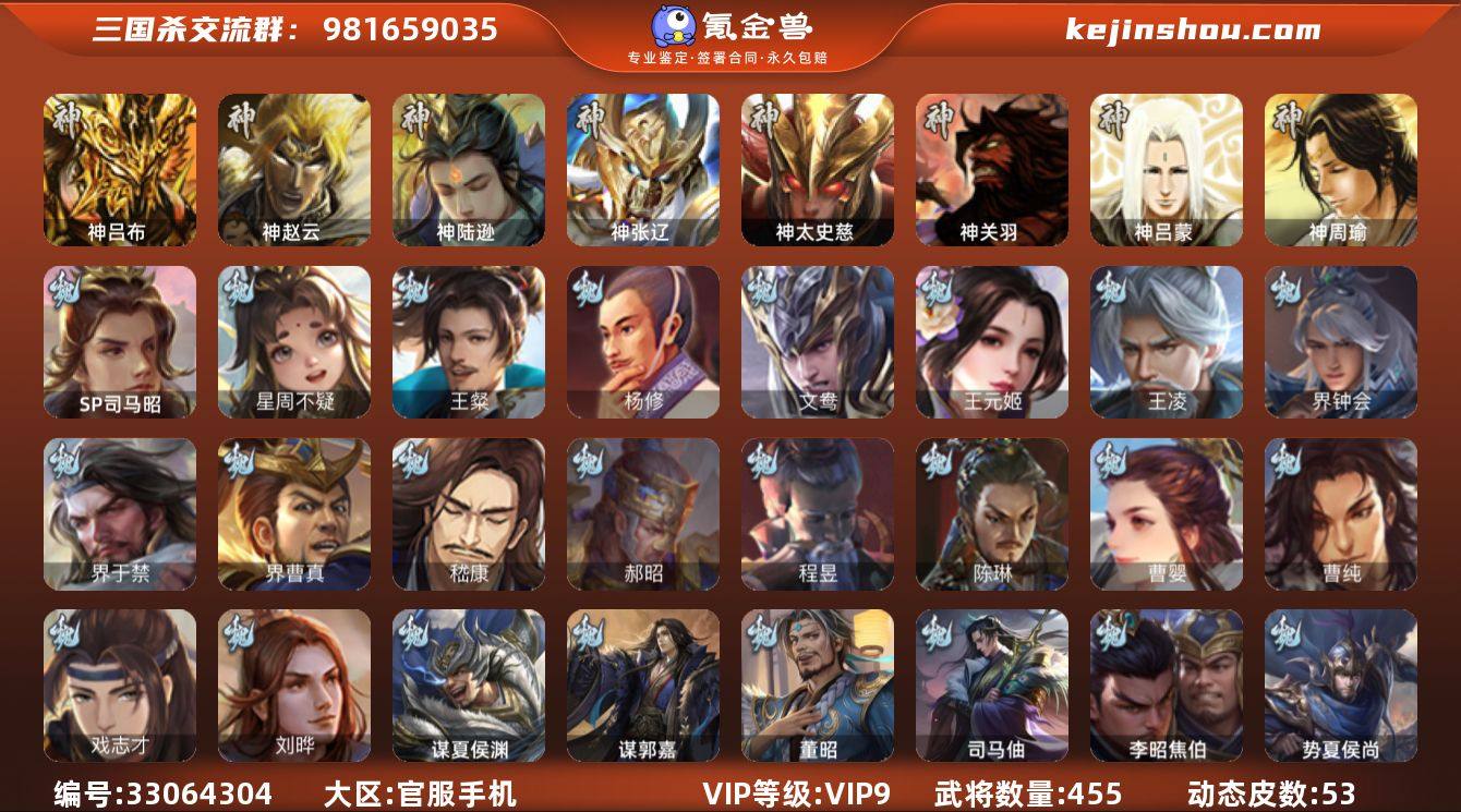 【14789987】官阶:大将军;VIP等级:VIP9;史诗武将数量:68;动态皮肤数量:53;武将总数:455;史诗宝珠数量:27;将魂数量:1789;神将:5;魏国史诗武将:28;蜀国史诗武将:13;吴国史诗武将:10;群史诗武将:25