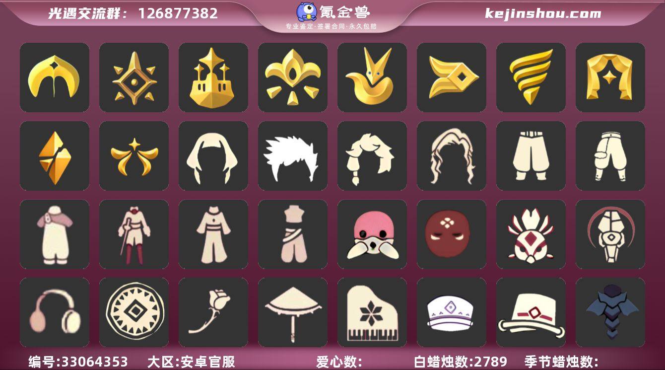 [18039515]账号类型: 邮箱账号 季节已毕业: 圣岛季,预言季,梦想季,小王子季,风行季,潜海季,表演季,破晓季,欧若拉季,集结季 完成地图: 晨岛,云野,雨林,霞谷,暮土,禁阁 珍稀物品: 鳐鲲斗篷,阿努比斯(狗头),白枭,透明蝶翼斗,玫瑰花 礼包: 巫师,围巾,橘子,贝壳,兔子,雪花,创始人 裤子: 武士裤,背带裤,搓澡巾,击剑裤,王子服,蓝绿裤 面具: 阿努比斯,凤凰面具,贴花面具,呼吸面具,黄眉企鹅面具 面饰: 红耳机 发型: 若笠,虚荣,单侧绑发,小王子发型,留辫蘑菇头 头饰: 行军锅头盔,羽毛发饰,蓝色音乐会,平顶帽 斗篷: 海洋斗,蟑螂斗,遥鲲斗篷,黄色连帽披风,燕尾斗篷,冥龙斗篷 配饰: 雨伞,高音钢琴,玫瑰花,圆鼓,蓝色手碟 亮点: 【优质装备】:预言季,阿努比斯(狗头),表演季,白枭(帝企鹅发),武士裤,圣岛季,梦想季,小王子季(王子季),风行季,潜海季,破晓季,鳐鲲斗篷,透明蝶翼斗,欧若拉季(欧若拉),行军锅头盔(六边锅帽子)(双耳锅帽子),羽毛发饰(多羽发饰),高音钢琴(白色高脚钢琴),集结季,玫瑰花,王子服(小王子套装),蓝绿裤(高领舞服),蟑螂斗(凤凰斗篷),凤凰面具,贴花面具(丛林黑面具),呼吸面具(潜水面具),黄眉企鹅面具,单侧绑发(单边小辫),小王子发型,留辫蘑菇头,遥鲲斗篷(双翼遥鲲斗),黄色连帽...