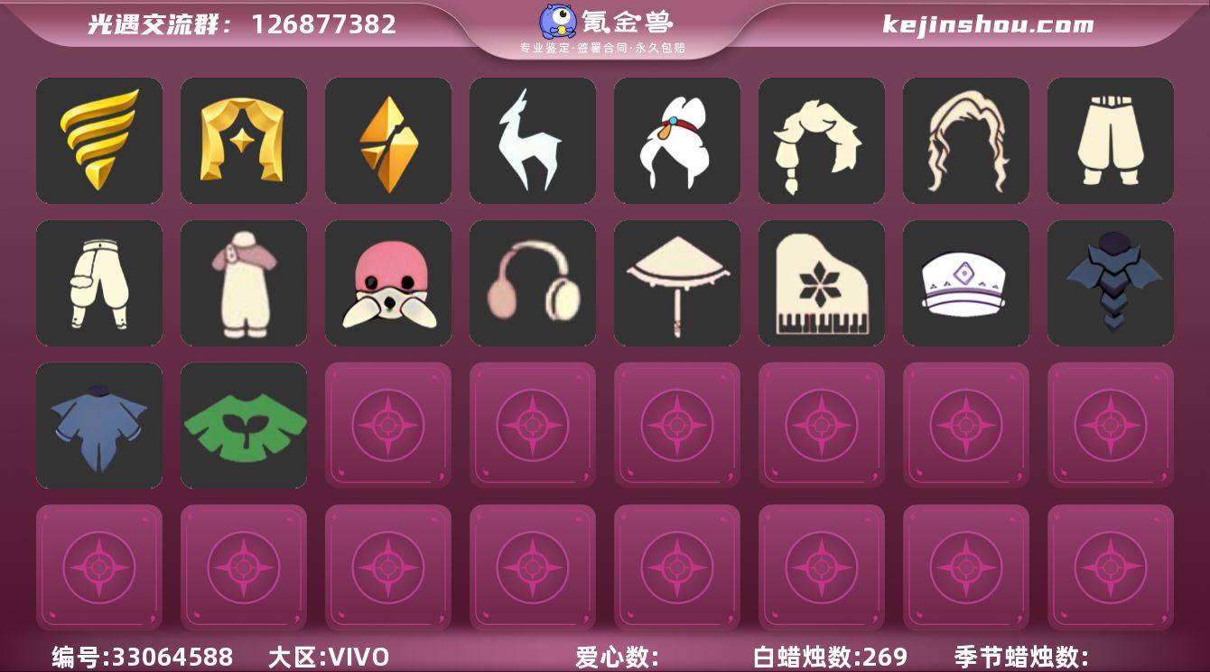 [18062072]账号类型: 手机账号 季节已毕业: 潜海季,表演季,破晓季,九色鹿季 完成地图: 雨林,霞谷 珍稀物品: 白枭 礼包: 蝙蝠套,巫师,绊爱,茶桌,橘子,兔子,蝴蝶结,创始人,小狗周年发饰,青衫落拓礼包 裤子: 武士裤,背带裤,搓澡巾 面具: 呼吸面具,夜行毕业面具,黄眉企鹅面具 面饰: 红耳机 发型: 若笠,虚荣,单侧绑发,飞天盘发 头饰: 蓝色音乐会,平顶帽 斗篷: 海洋斗,绿芽,遥鲲斗篷,燕尾斗篷,冥龙斗篷,领主红斗篷 配饰: 雨伞,高音钢琴 亮点: 【优质装备】:表演季,白枭(帝企鹅发),武士裤,潜海季,破晓季,高音钢琴(白色高脚钢琴),九色鹿(九色鹿季),呼吸面具(潜水面具),夜行毕业面具(棕熊面具),黄眉企鹅面具,单侧绑发(单边小辫),遥鲲斗篷(双翼遥鲲斗),燕尾斗篷,冥龙斗篷,领主红斗篷(暗红斗篷),飞天盘发(九色鹿丸子头),蝙蝠套(蝙蝠斗篷)(南瓜头),绊爱(绊爱斗篷)(绊爱礼包),茶桌(花憩茶桌),红耳机,巫师(巫师帽),雨林,霞谷,若笠(箬笠),蝴蝶结(大蝴蝶结),创始人(创始人斗篷),小狗周年发饰(小狗周年头饰),青衫落拓礼包,兔子(玉兔头饰)(玉兔发饰)(兔子发饰),橘子(大橘大利)