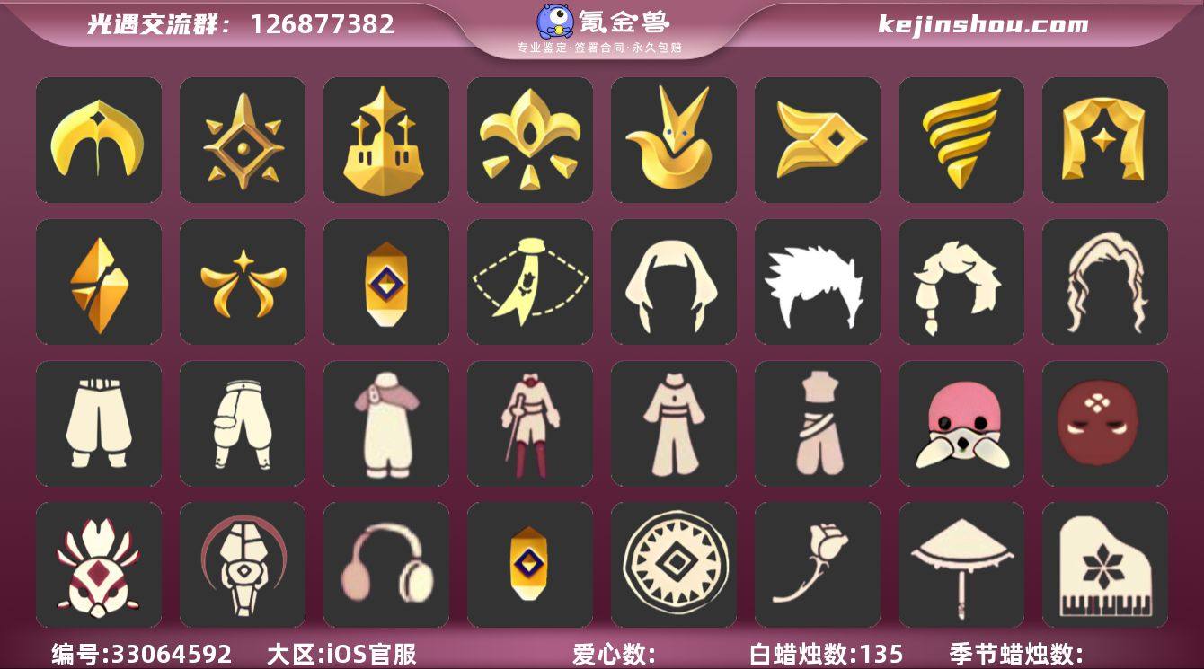 [18039164]账号类型: 手机账号 季节已毕业: 圣岛季,预言季,梦想季,小王子季,风行季,潜海季,表演季,破晓季,欧若拉季,集结季,追忆季 完成地图: 雨林,霞谷,暮土 珍稀物品: 鳐鲲斗篷,阿努比斯(狗头),白枭,透明蝶翼斗,玫瑰花 礼包: 蝙蝠套,巫师,围巾,欧若拉之翼,绊爱,鹿角,秋千,茶壶,白绒金,女巫裙,福娃,人声乐器,奔跑发型,雪花球,橘子,贝壳,红伞,兔子,枯角,雪花,猫套,猫背饰,星月头饰,彩虹耳钉,魔法棒 裤子: 武士裤,背带裤,搓澡巾,击剑裤,王子服,蓝绿裤 面具: 阿努比斯,凤凰面具,贴花面具,呼吸面具,黄眉企鹅面具 面饰: 红耳机 项链: 围巾 发型: 若笠,虚荣,单侧绑发,小王子发型,留辫蘑菇头 头饰: 行军锅头盔,羽毛发饰,蓝色音乐会,平顶帽 斗篷: 海洋斗,蟑螂斗,遥鲲斗篷,黄色连帽披风,燕尾斗篷,冥龙斗篷 配饰: 雨伞,高音钢琴,玫瑰花,圆鼓,蓝色手碟,鲲灯 亮点: 【优质装备】:预言季,阿努比斯(狗头),表演季,白枭(帝企鹅发),武士裤,圣岛季,梦想季,小王子季(王子季),风行季,潜海季,破晓季,鳐鲲斗篷,透明蝶翼斗,欧若拉季(欧若拉),行军锅头盔(六边锅帽子)(双耳锅帽子),羽毛发饰(多羽发饰),高音钢琴(白色高脚钢琴),集结季,玫瑰花,追忆季,王子服(小王子套装),蓝绿裤(高领舞服),蟑螂斗(凤凰...