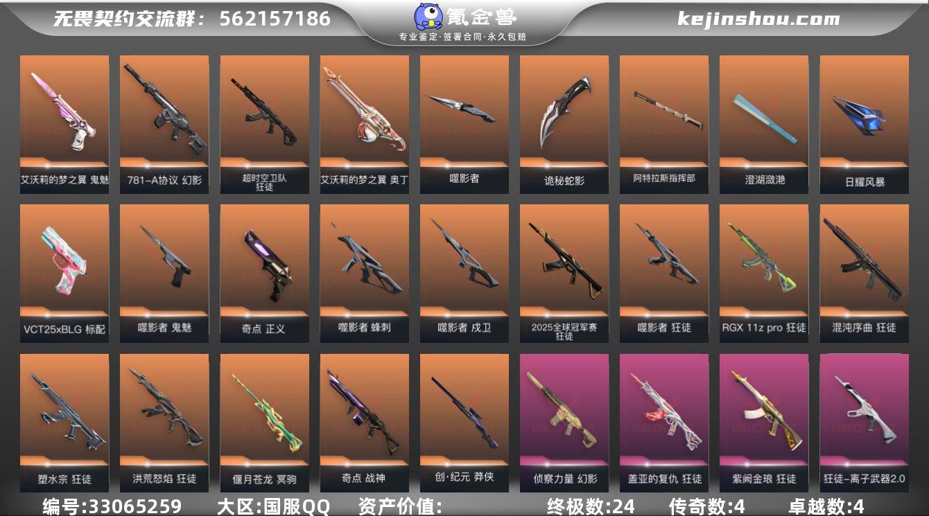 【948036】段位: 未定级 套装: 噬影者 近战武器皮肤: 澄湖潋滟,落英飞旋-千灵华绽,噬影者簇刃,诡秘蛇影,日耀风暴,阿特拉斯指挥部,影钩-掠影2.0,魔术火花-奇幻朋克3.0,碎心裂刃,蒙太奇 战斧 步枪皮肤: 狂徒-紫阙金琅,狂徒-盖亚的复仇,幻影-侦察力量,狂徒-塑水宗,幻影-781-A协议,狂徒-洪荒怒焰,狂徒-混沌序曲,狂徒-噬影者,戍卫-噬影者,狂徒-离子武器2.0,狂徒-RGX 11z pro,狂徒-超时空卫队,2025全球冠军赛 狂徒,超集系统 狂徒,蒙太奇 幻影,风暴之子 戍卫 佩枪皮肤: 正义-奇点,鬼魅-艾沃莉的梦之翼,标配-VCT25xBLG,鬼魅-噬影者,超集系统 标配,风暴之子 正义,蒙太奇 狂怒 狙击枪皮肤: 冥驹-偃月苍龙,莽侠-创·纪元,风暴之子 冥驹,超集系统 飞将 冲锋枪皮肤: 蜂刺-噬影者,蒙太奇 骇灵 霰弹枪皮肤: 风暴之子 雄鹿 机枪皮肤: 战神-奇点,奥丁-艾沃莉的梦之翼,蒙太奇 战神 亮点: 【优质装备】:正义-奇点,冥驹-偃月苍龙,狂徒-塑水宗,幻影-781-A协议,狂徒-混沌序曲,狂徒-紫阙金琅,狂徒-盖亚的复仇,幻影-侦察力量,狂徒-洪荒怒焰,狂徒-RGX 11z pro,奥丁-艾沃莉的梦之翼,澄湖潋滟,落英飞旋,鬼魅-艾沃莉的梦之翼,噬影者簇刃,诡秘蛇影,日耀风暴 遗器,阿特拉斯指挥部,影钩,魔术火花,2025全球冠军...