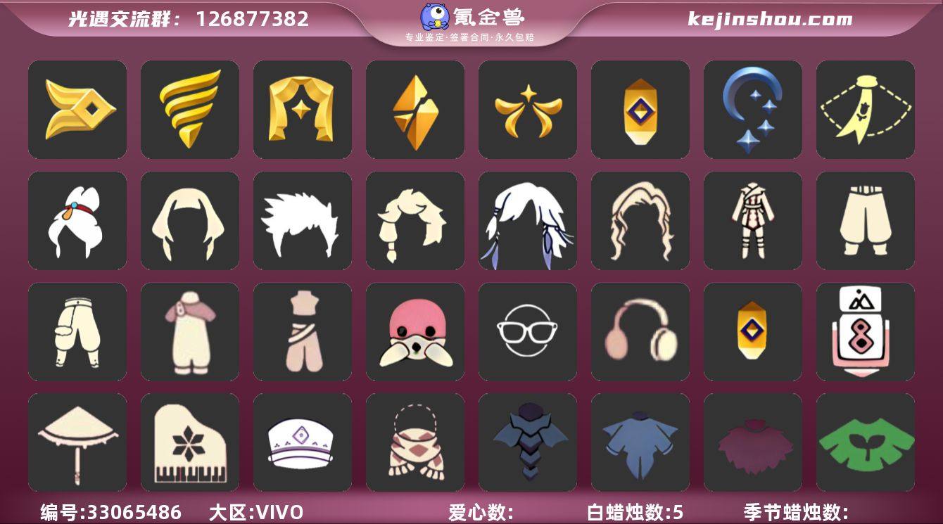 [18060879]账号类型: 手机账号 季节已毕业: 风行季,潜海季,表演季,破晓季,欧若拉季,夜行季,追忆季 完成地图: 晨岛,云野,雨林,霞谷,暮土,禁阁 珍稀物品: 白枭,透明蝶翼斗 礼包: 蝙蝠套,巫师,围巾,绊爱,大铁头,蜘蛛斗,兔子鞋,茶桌,餐桌,白绒金,福娃,吉他,人声乐器,彩虹帽,雪花球,橘子,贝壳,红伞,兔子,南瓜,雪花,水母,星月头饰,彩虹耳钉,彩虹耳机,新年裤,蝴蝶结,奥利奥,四叶草,暗彩装扮,向日葵套,创始人,海龟斗篷,小狗周年发饰 裤子: 武士裤,背带裤,搓澡巾,蓝绿裤,风行毕业裤子 面具: 呼吸面具,夜行毕业面具,黄眉企鹅面具 面饰: 红耳机,黑框眼镜 项链: 围巾 发型: 归巢毕业发型,若笠,虚荣,单侧绑发,小王子发型,留辫蘑菇头,飞天盘发 头饰: 羽毛发饰,蓝色音乐会,平顶帽 斗篷: 海洋斗,绿芽,粉红绒毛斗篷,遥鲲斗篷,燕尾斗篷,冥龙斗篷,领主红斗篷 配饰: 雨伞,高音钢琴,相机,鲲灯 亮点: 【优质装备】:表演季,白枭(帝企鹅发),武士裤,风行季,潜海季,破晓季,透明蝶翼斗,欧若拉季(欧若拉),归巢毕业发型(五塑彩羽发),羽毛发饰(多羽发饰),高音钢琴(白色高脚钢琴),夜行季,追忆季,相机(季卡相机),蓝绿裤(高领舞服),围巾(肩带),风行毕业裤子(羽袖长袍),呼吸面具(潜水面具),夜行毕业面具(棕熊面具...